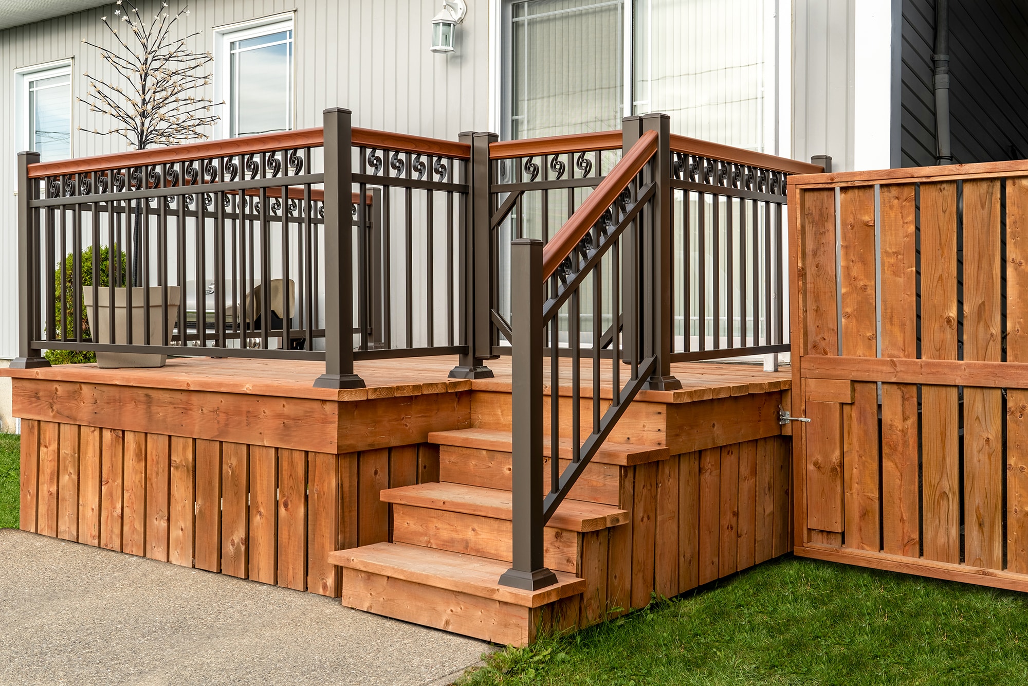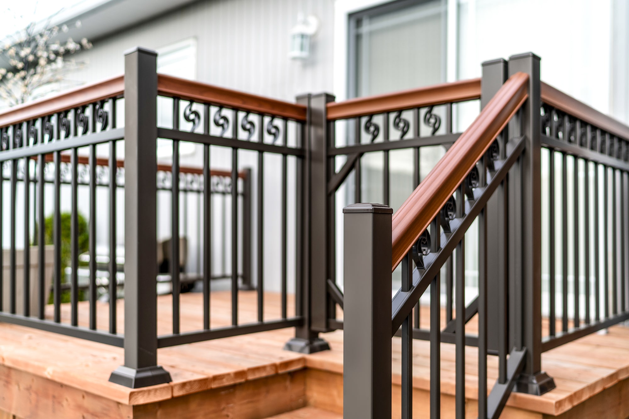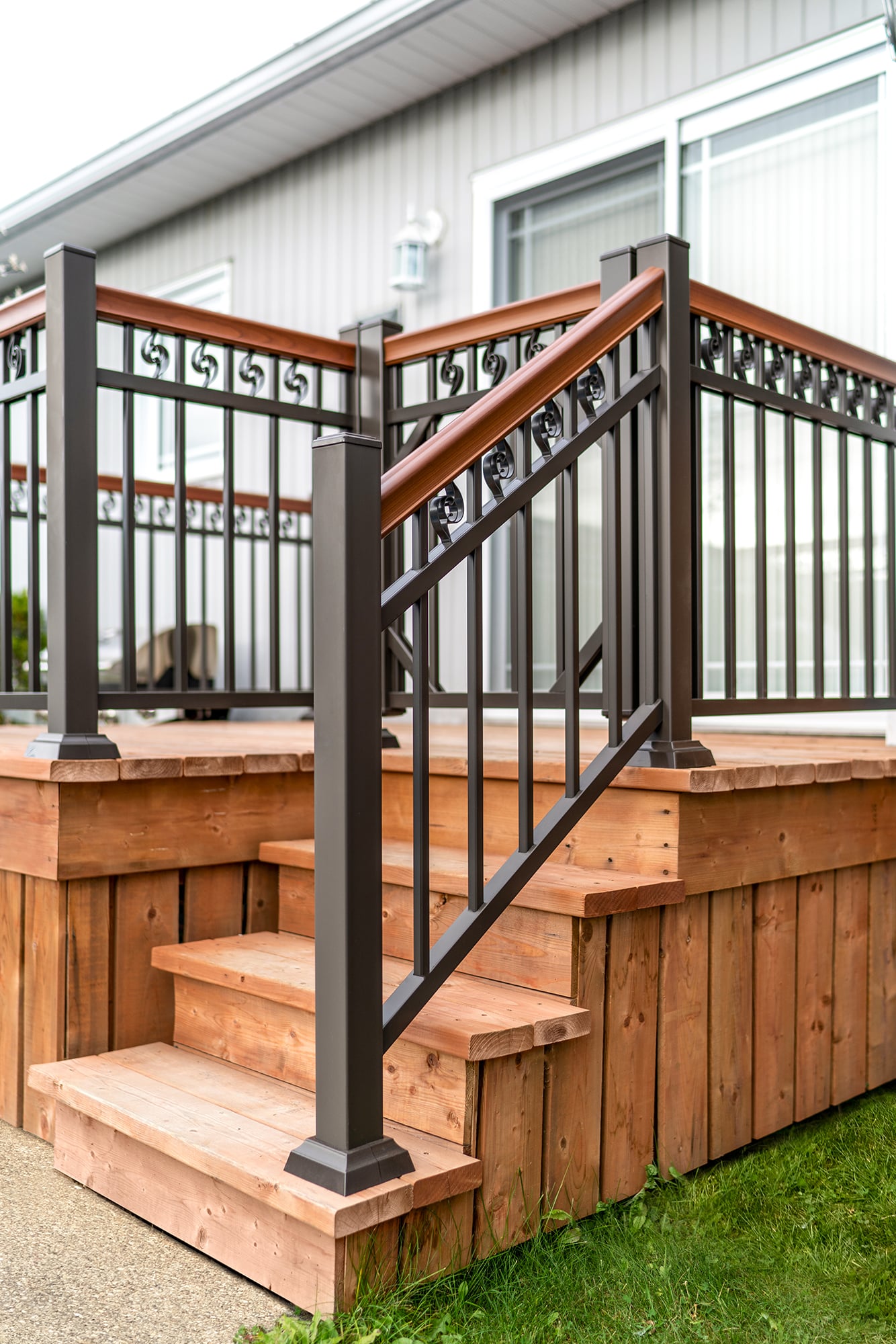 The Chemin Cloutier project sought to equip a patio and its staircase with a railing that recalls the classic charm of wrought iron while offering the modern advantages of maintenance-free aluminum. Our Ornementale model was chosen for its timeless style and the warmth provided by the cherry-colored handrail. It provides elegant, long-lasting security for your outdoor space.