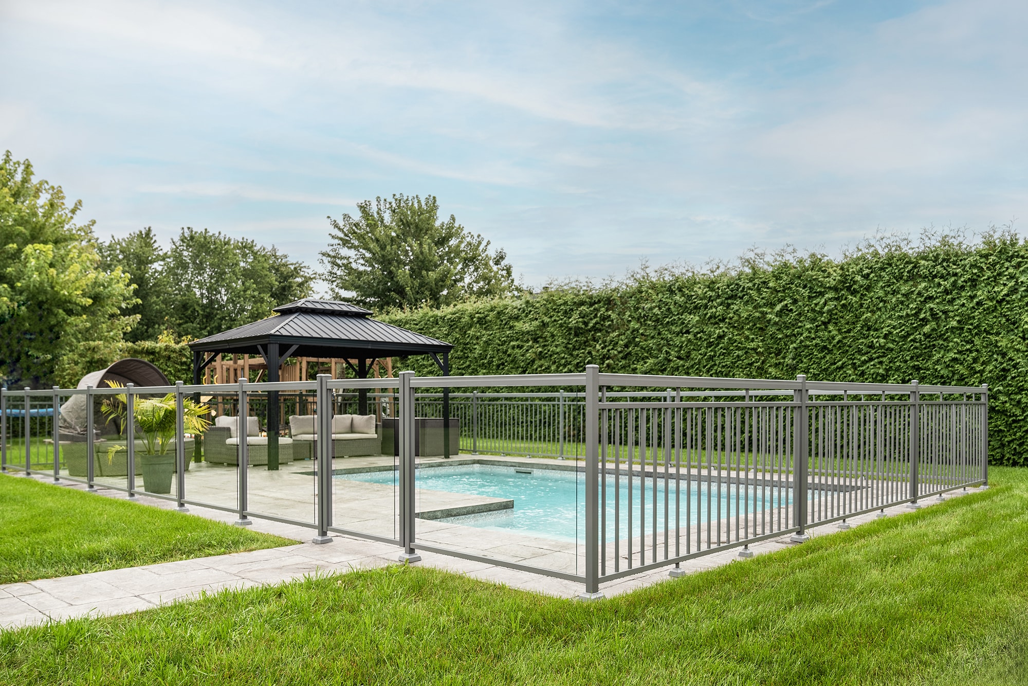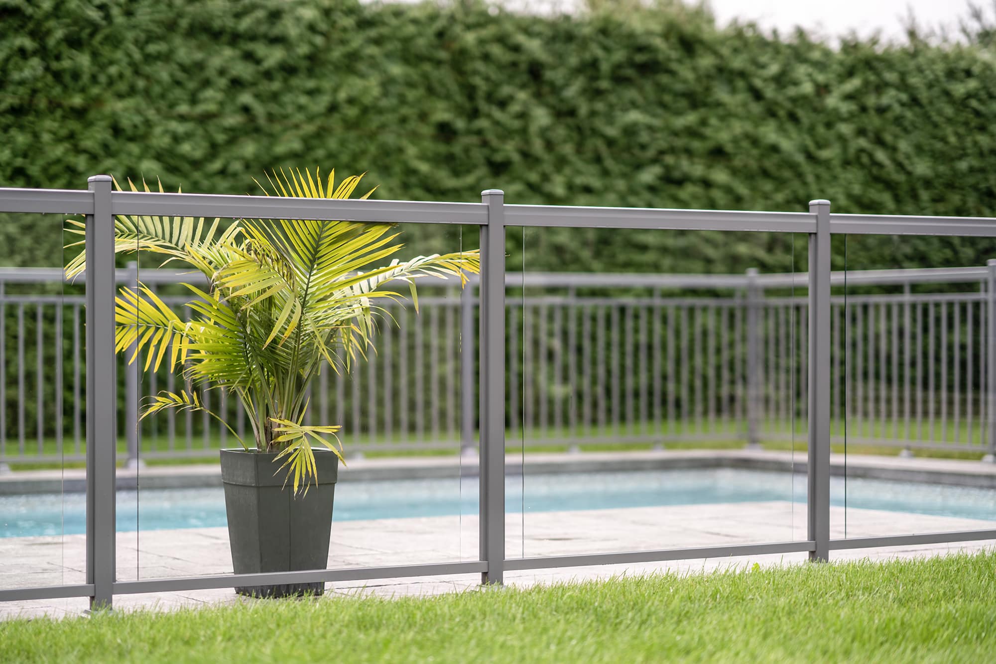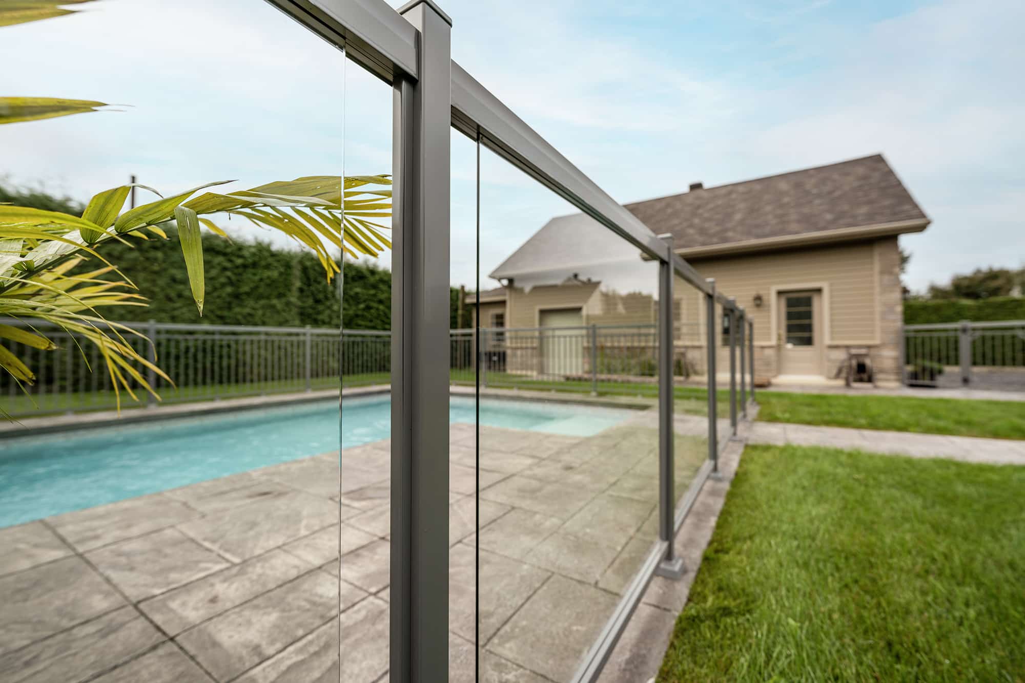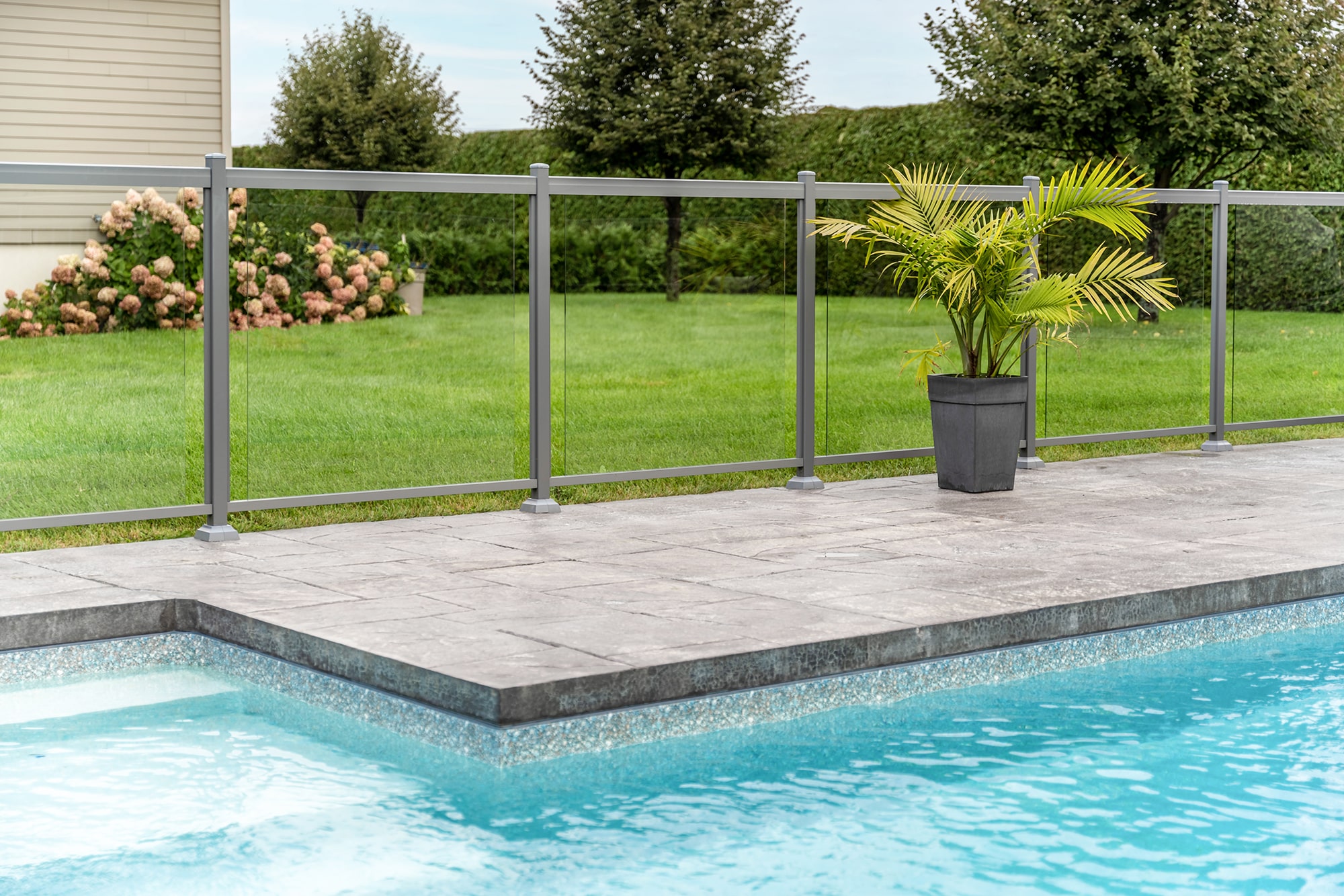 Murano railing in aluminum and glass: installed on several sections of the fence, it offers maximum transparency around the pool and allows an unobstructed view of the relaxation area and grounds.