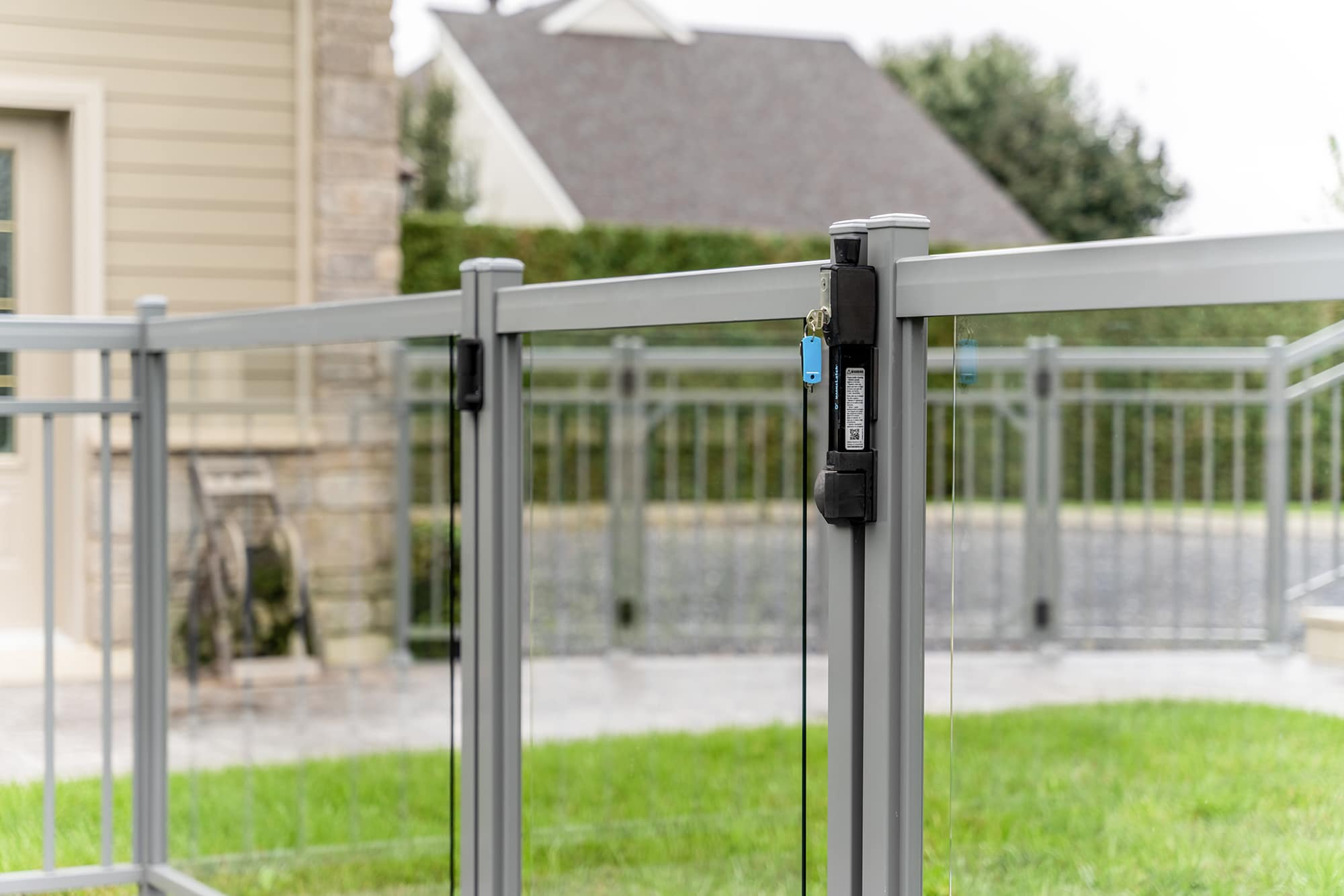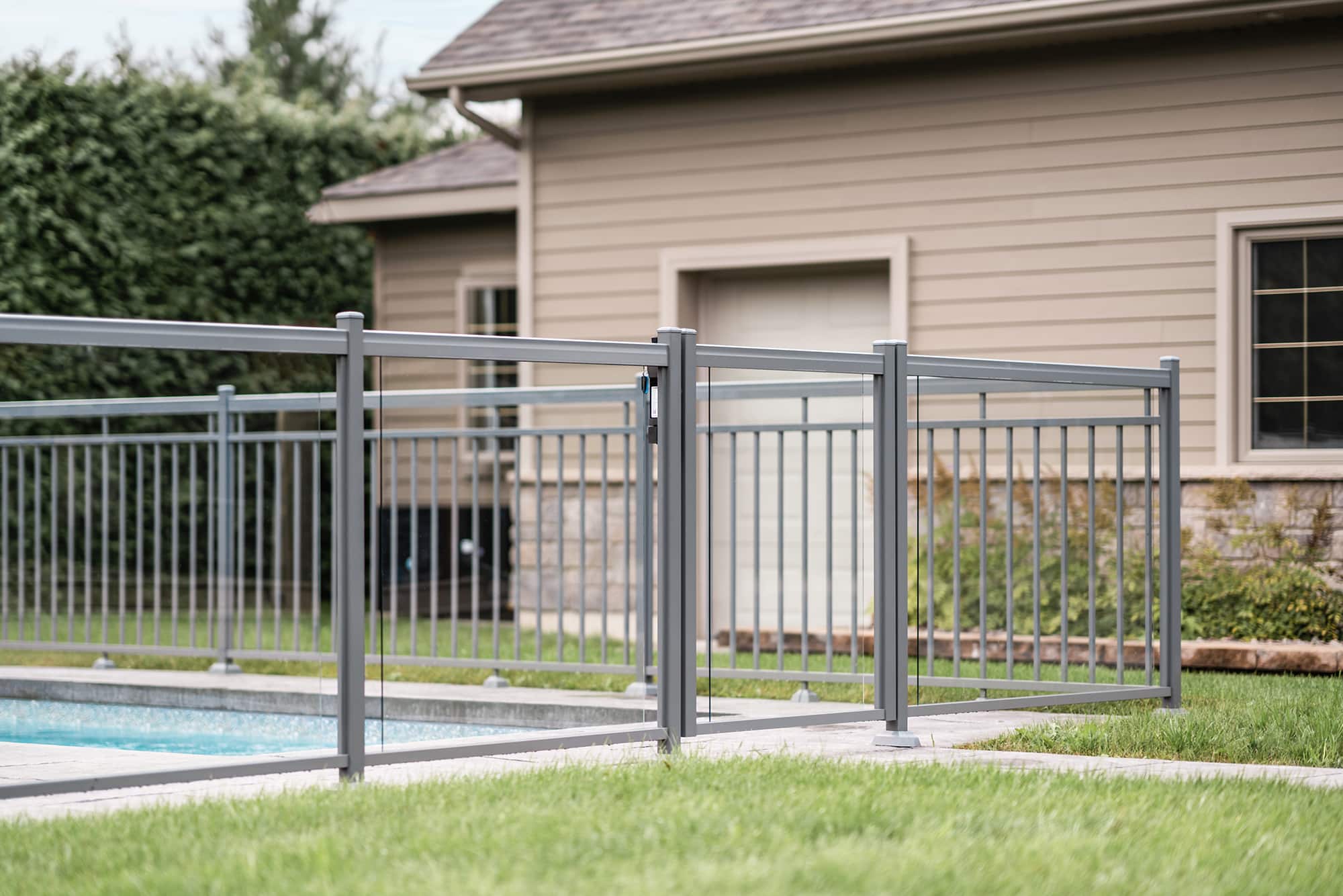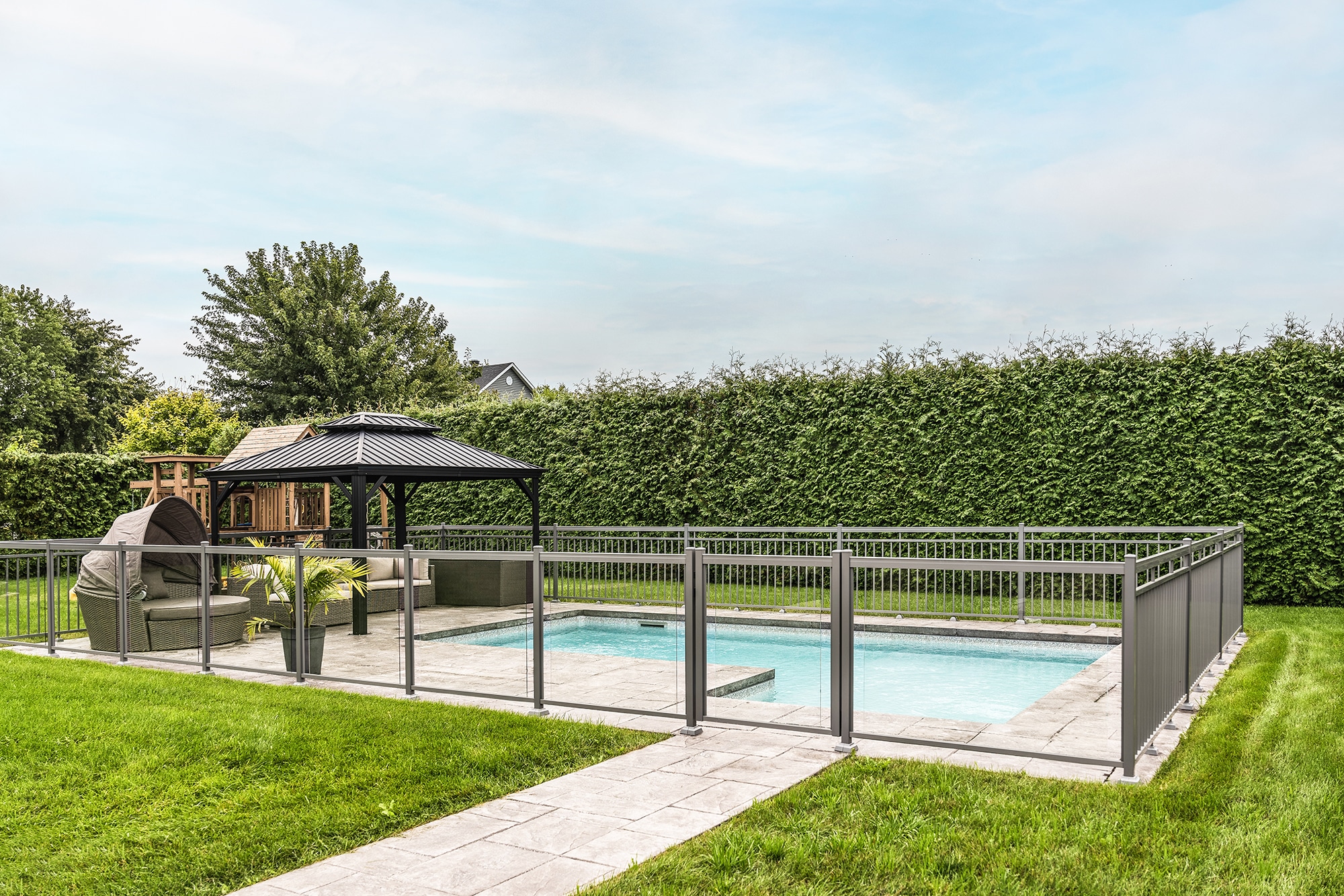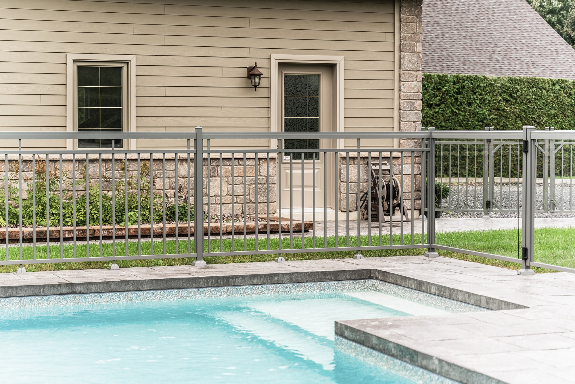 Murano railing in aluminum and glass: installed on several sections of the fence, it offers maximum transparency around the pool and allows an unobstructed view of the relaxation area and grounds.