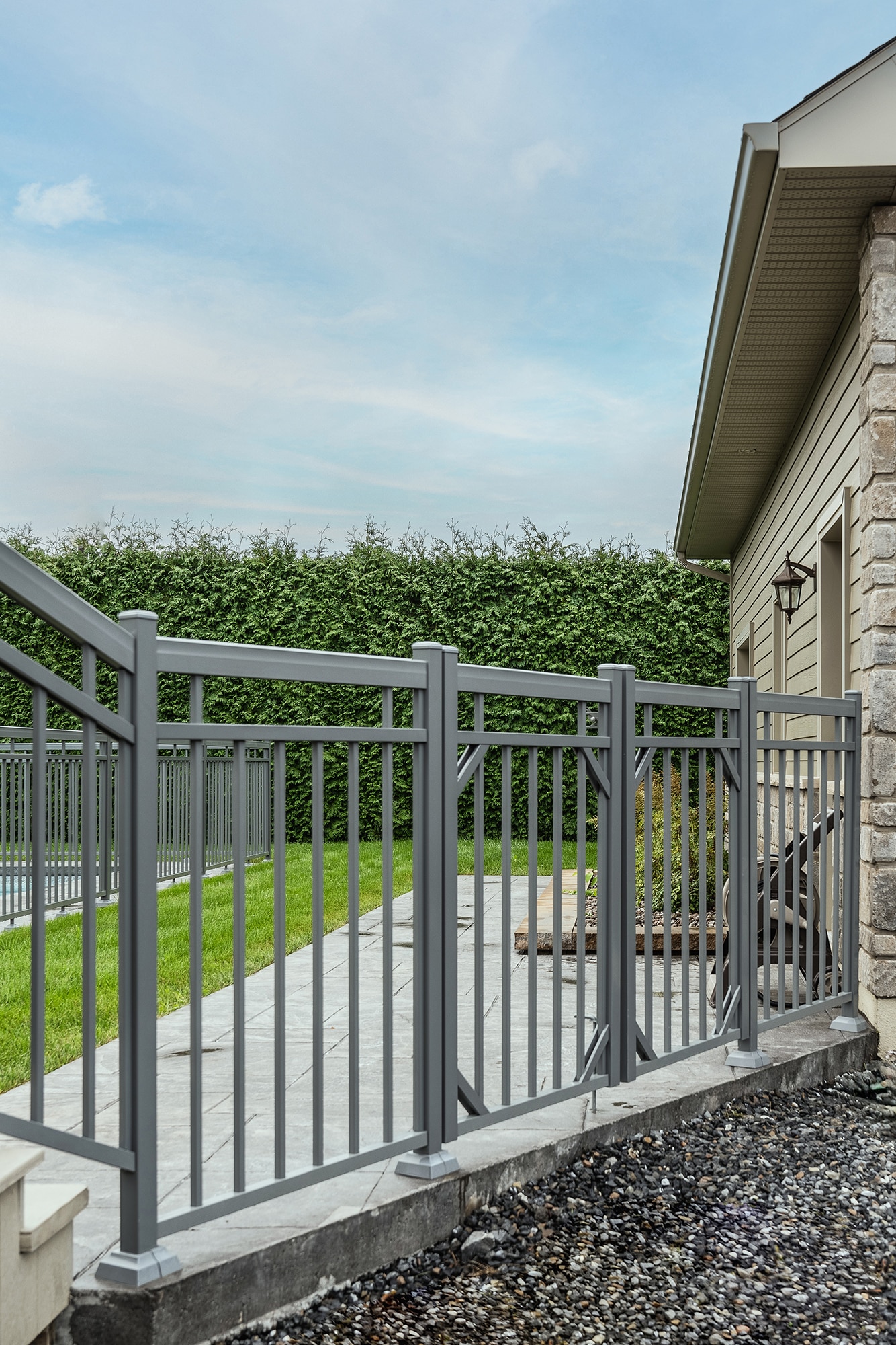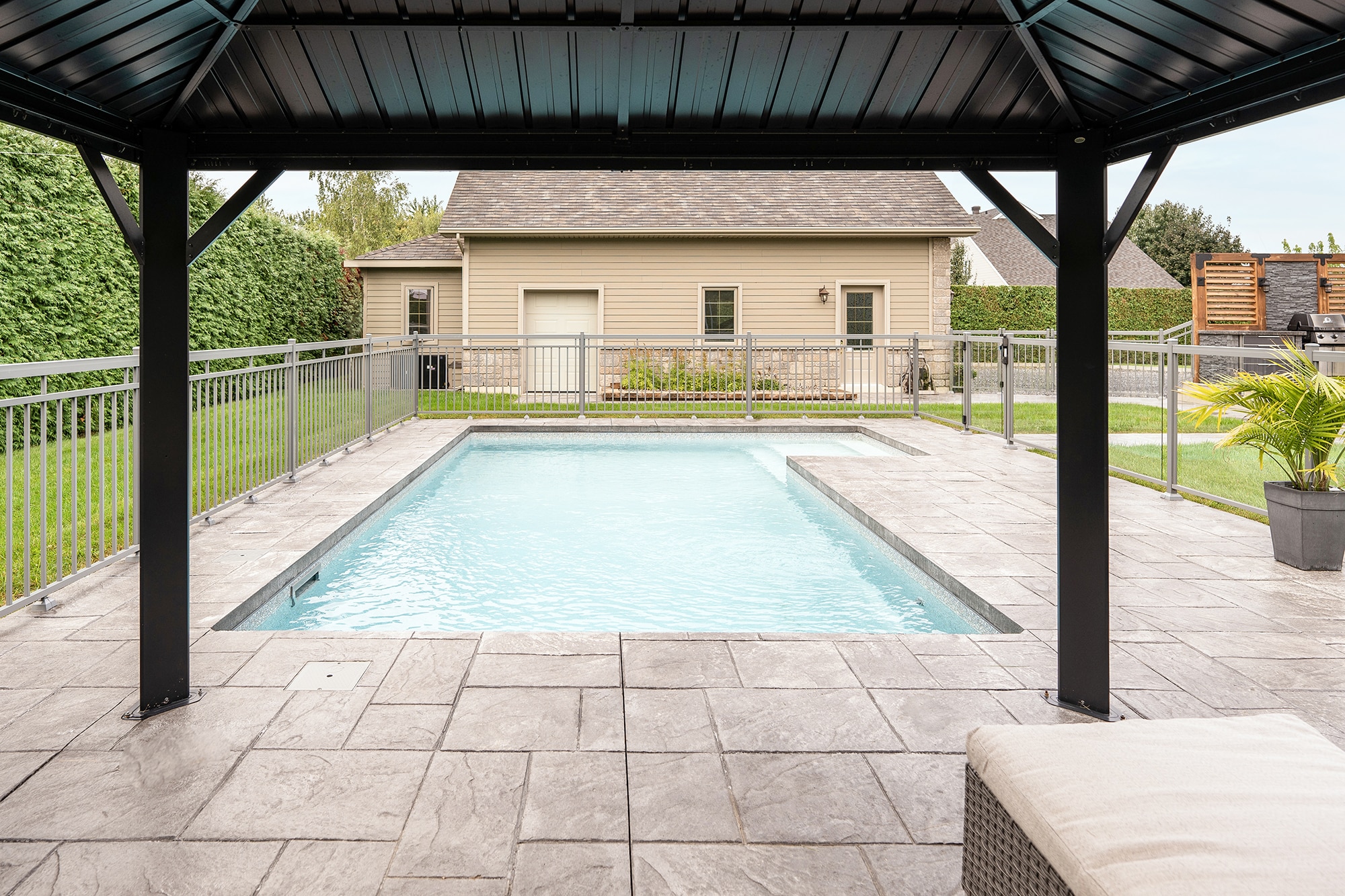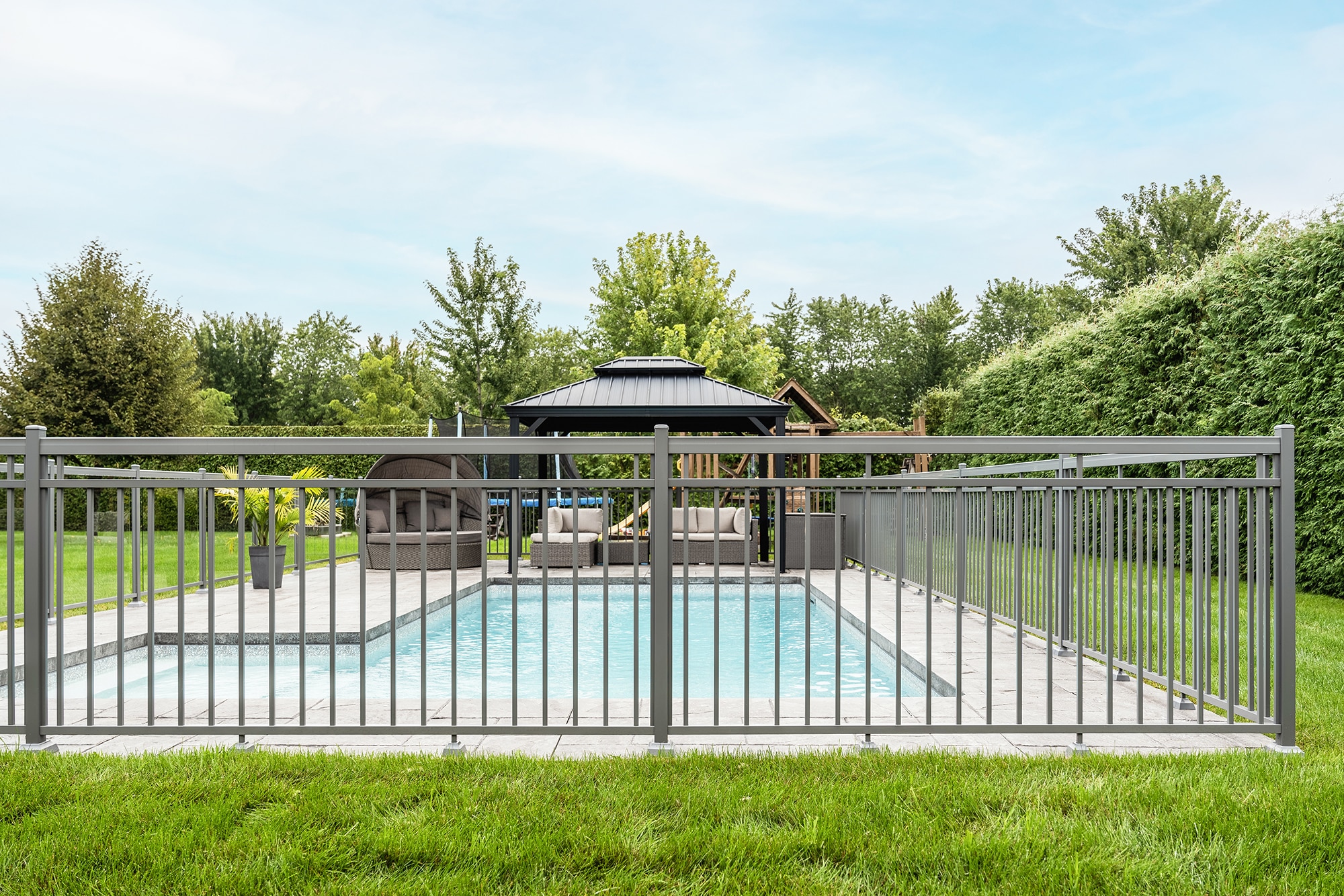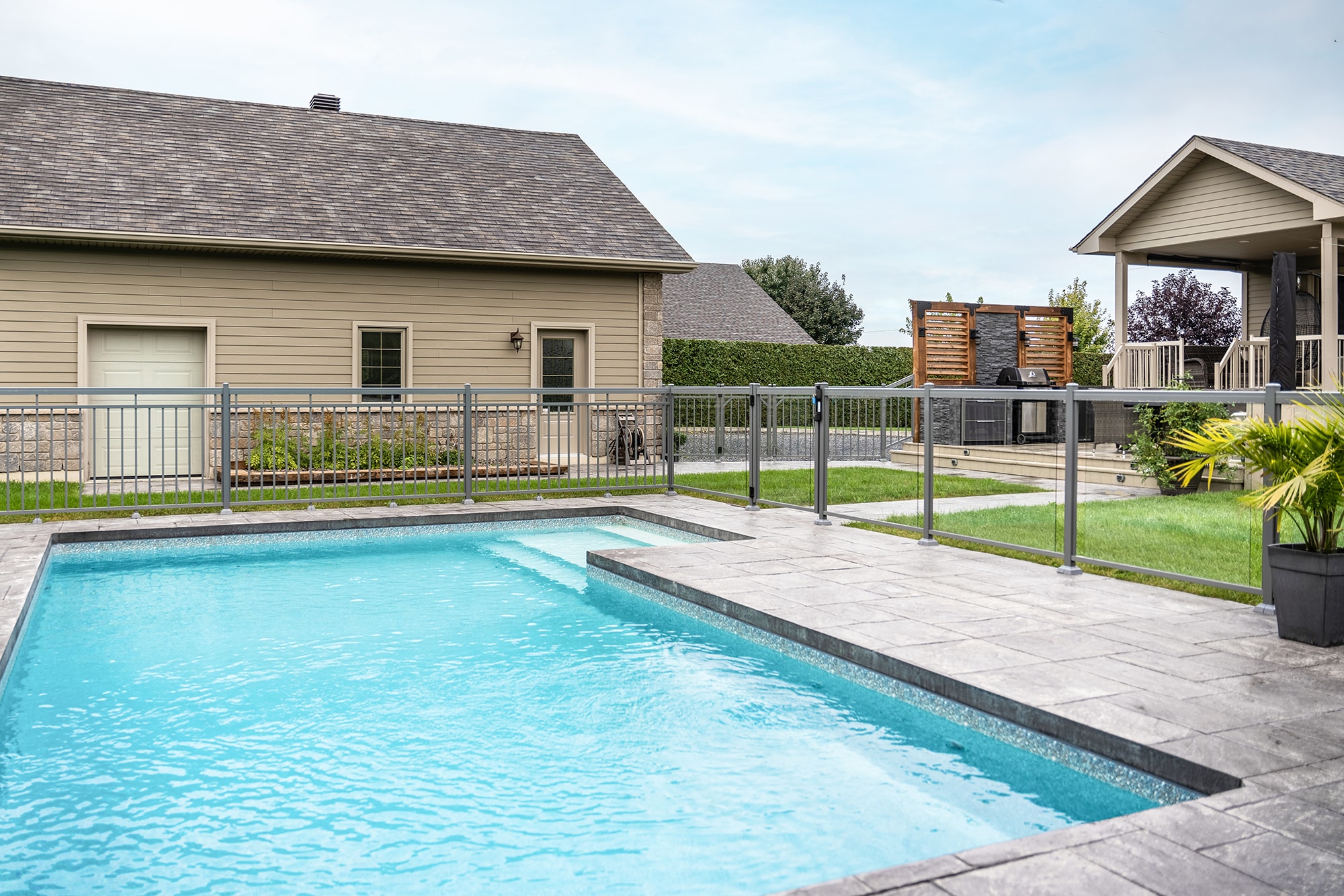 This project on chemin de Saint-Dominique in St-Pie features a complete pool tower design, combining our Murano and Contemporaine railings to offer safety, visual clarity and architectural style. The result is an elegant, functional pool area perfectly integrated into the rear layout.