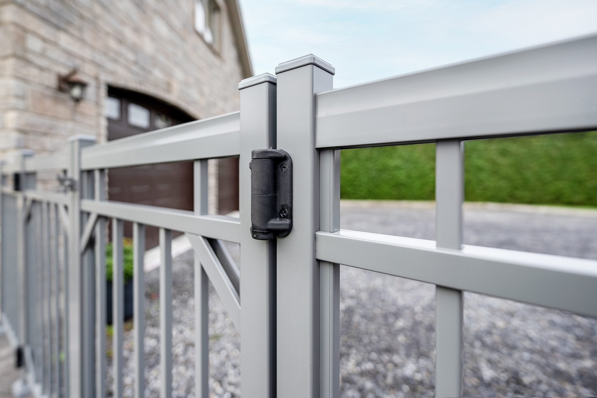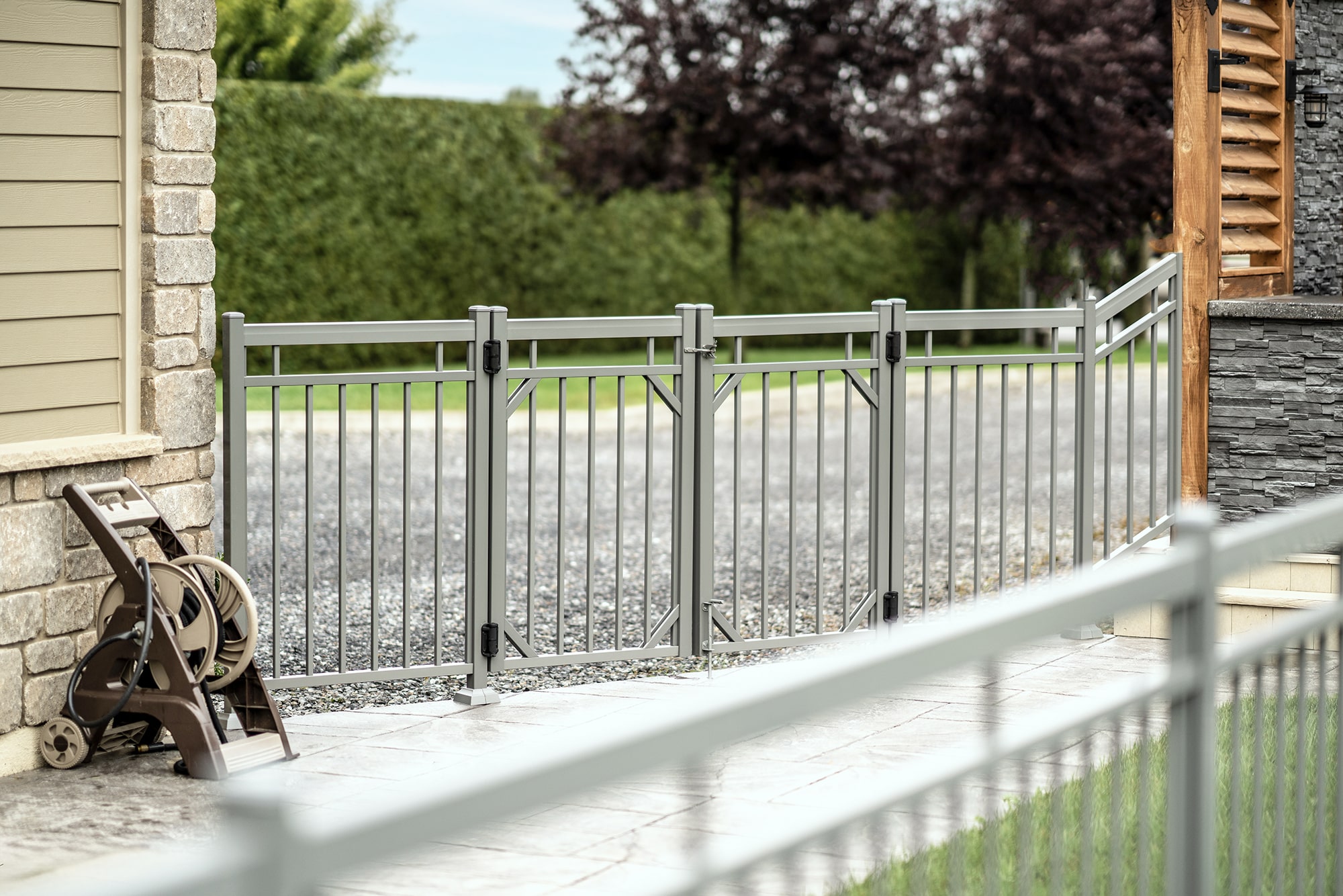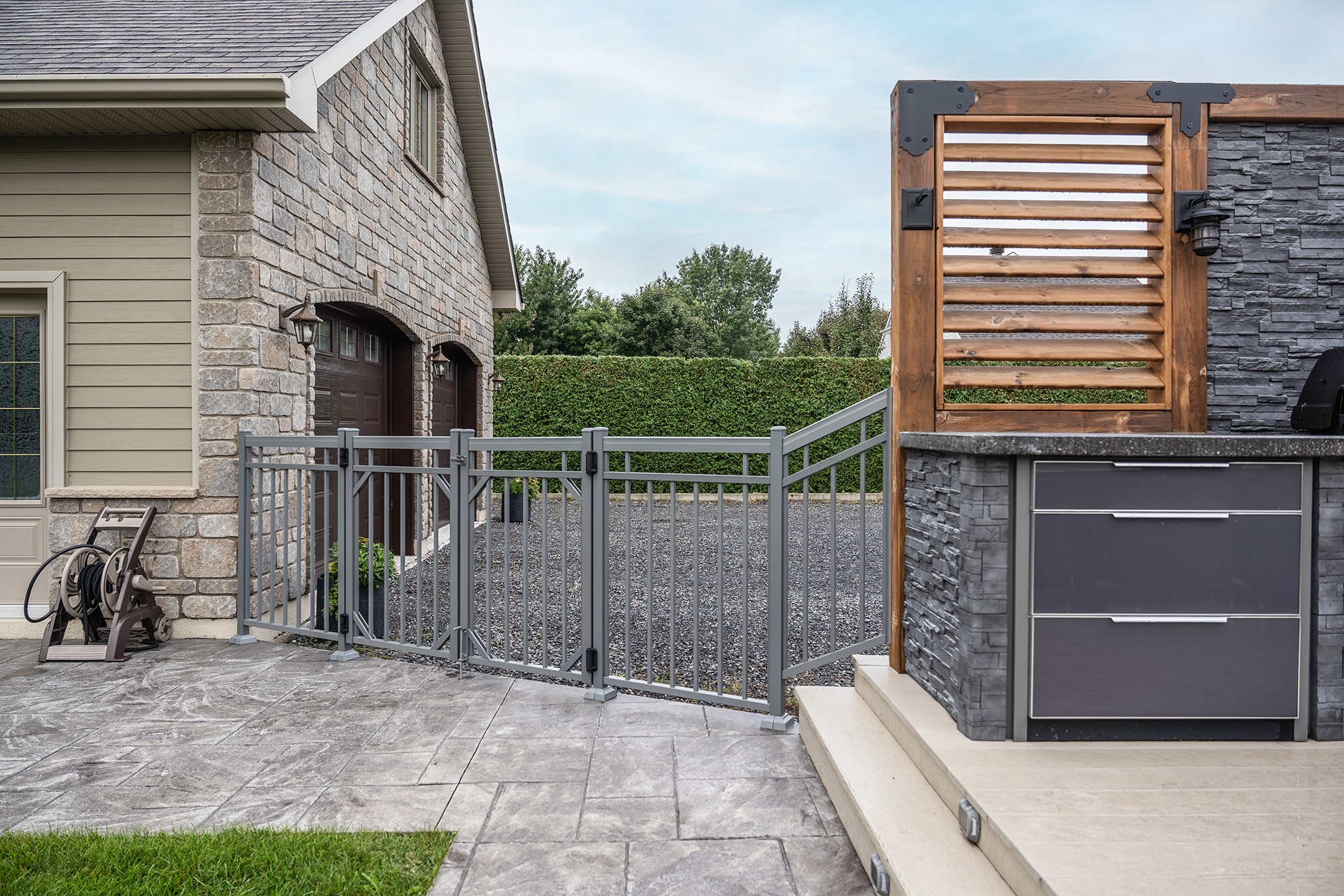 Pale gray finish: a harmonious choice that blends perfectly with the stone, paving and natural tones of the courtyard, creating a uniform, refined whole.