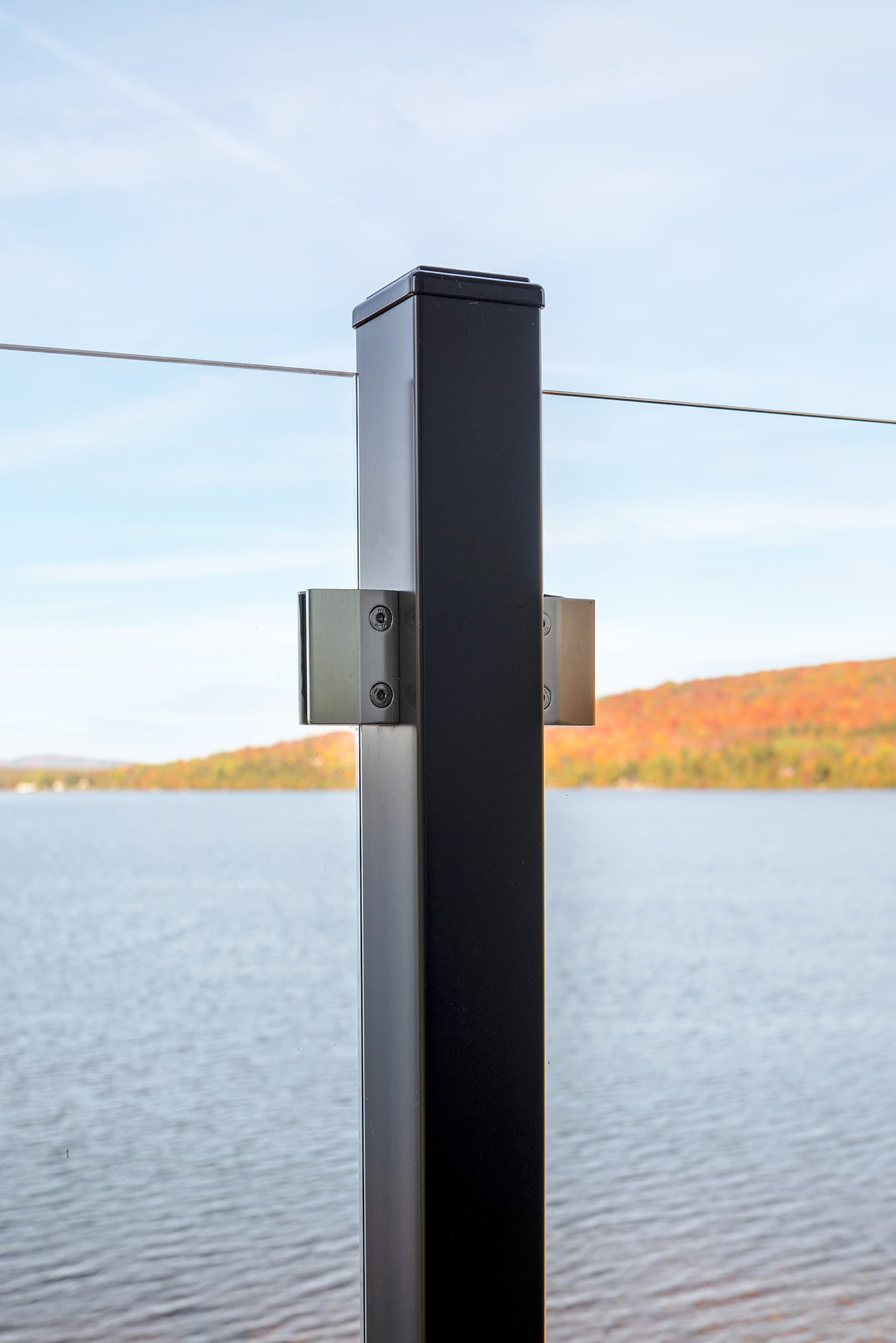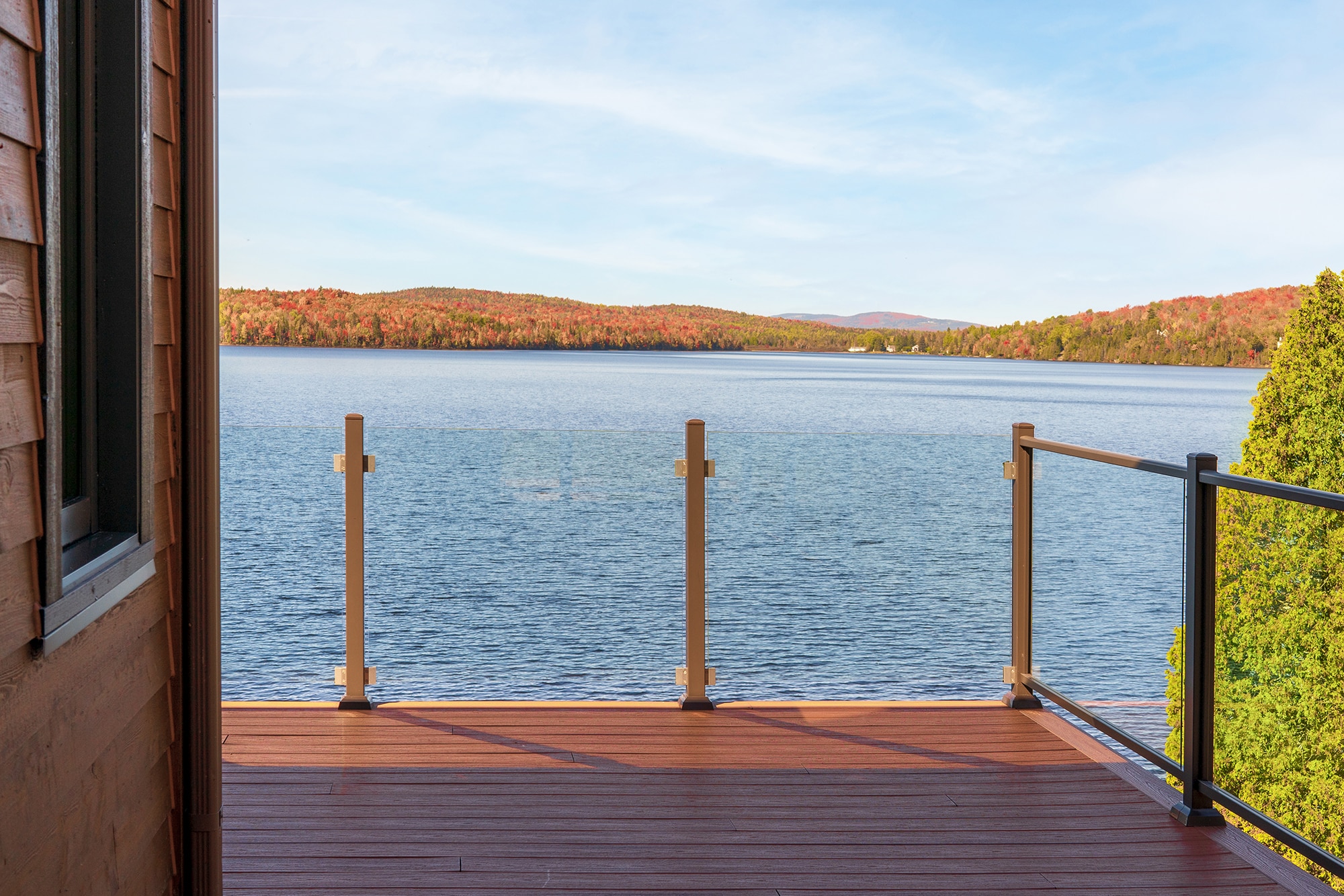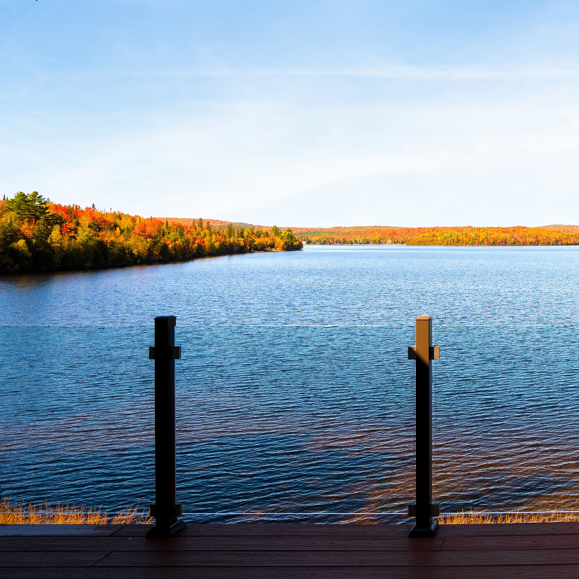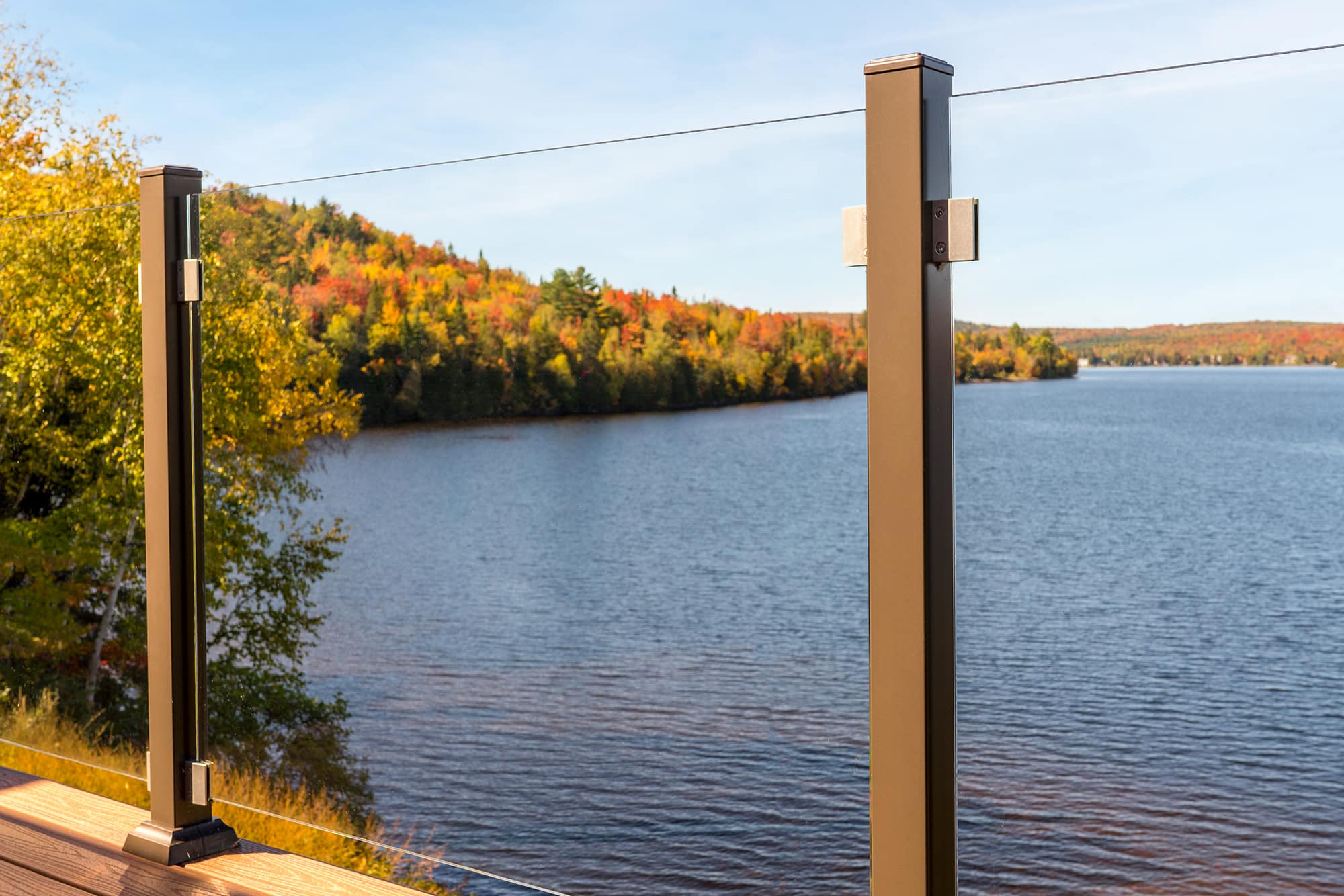 Clear Glass Panels: The ideal choice for an unobstructed view. Safety glass panels create an unobtrusive barrier that maximizes lake and forest views.
