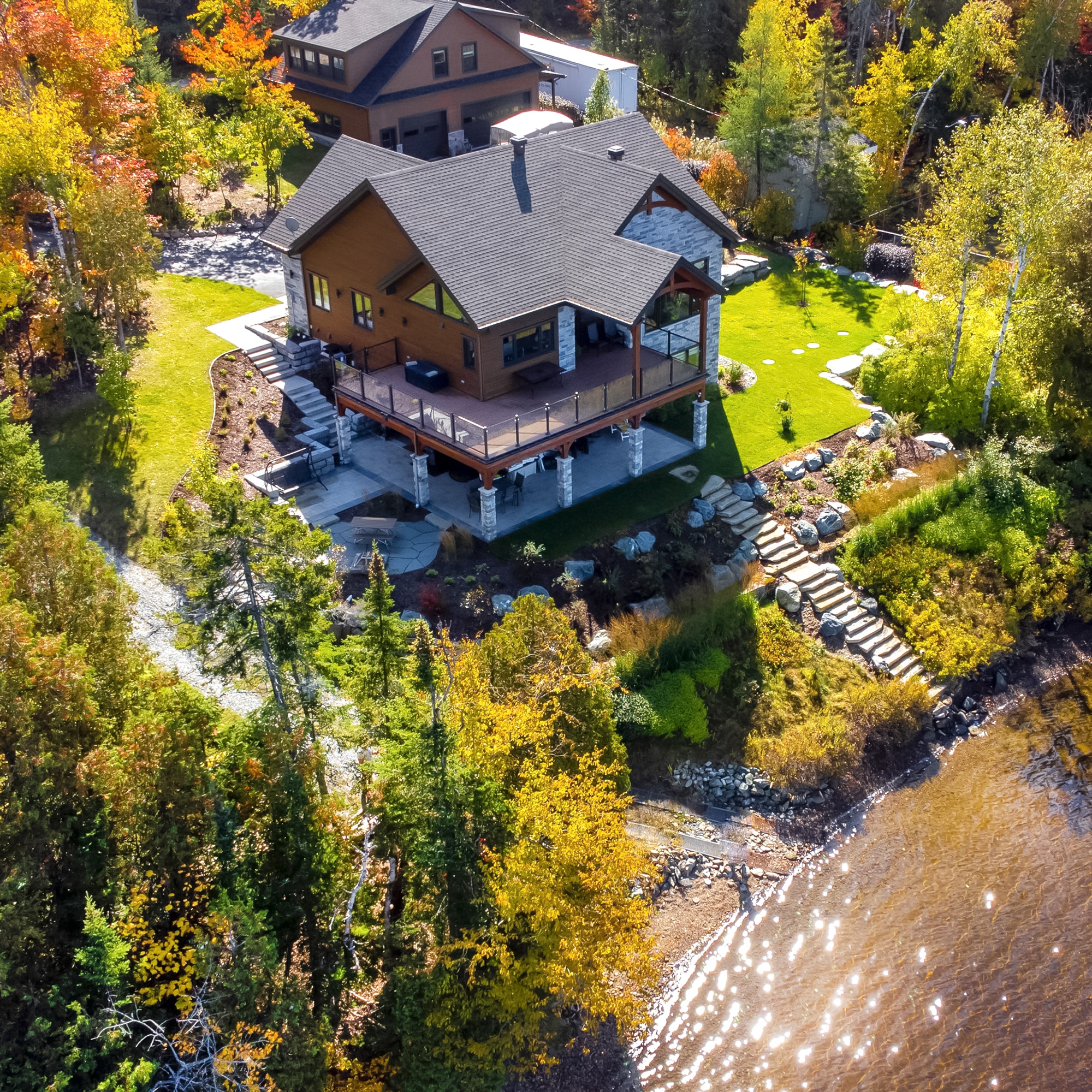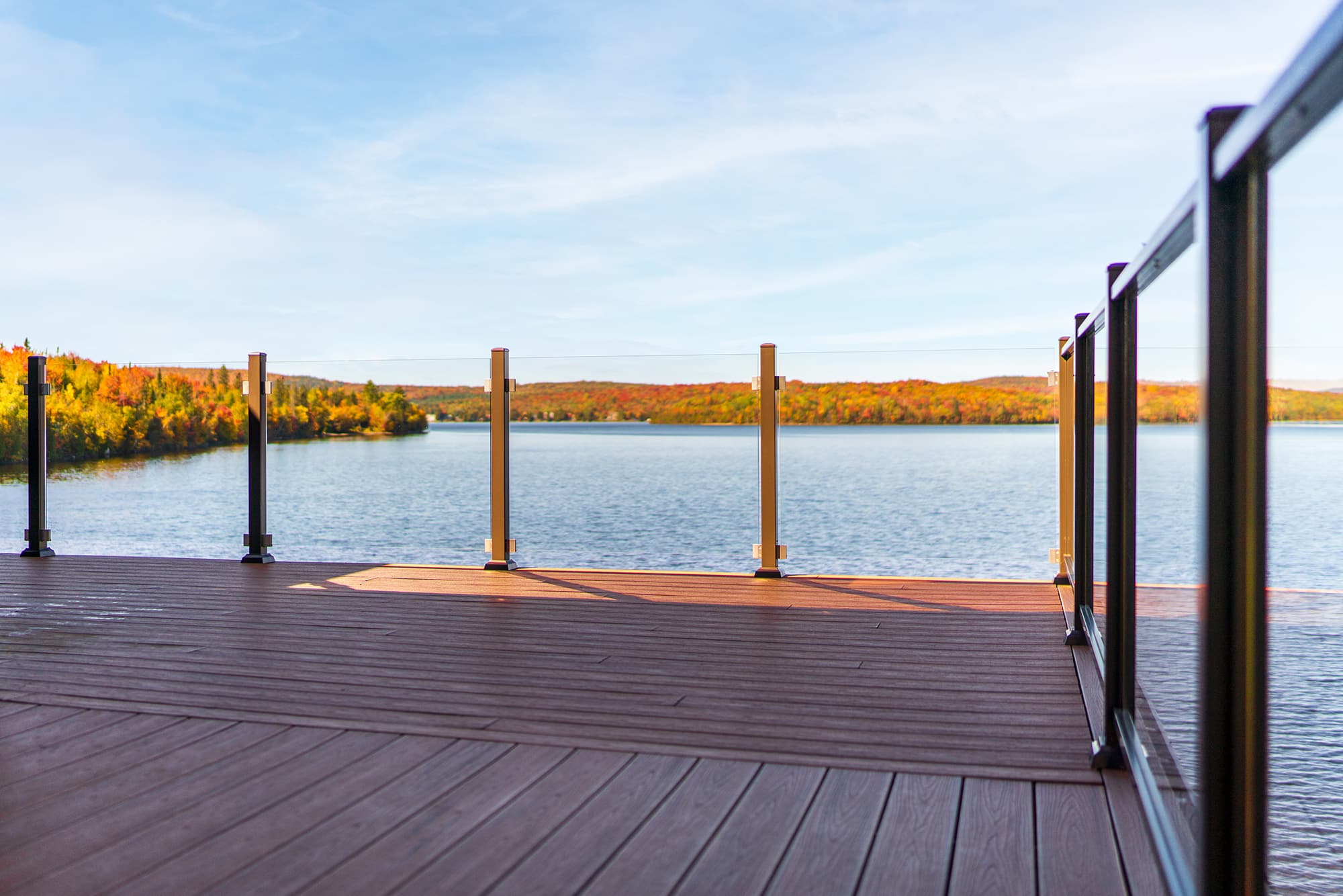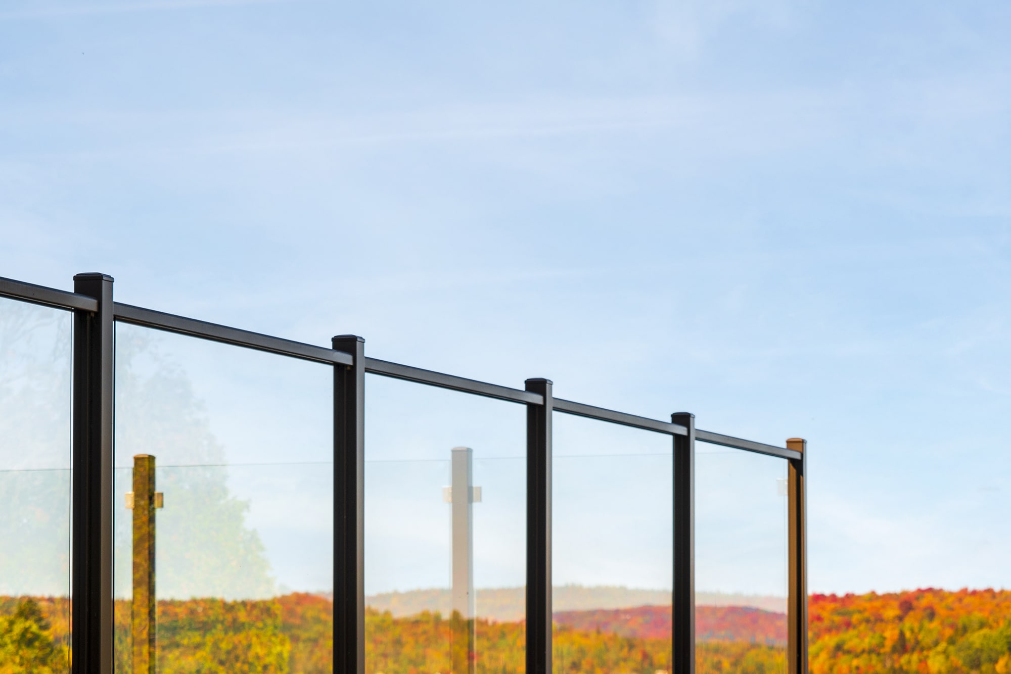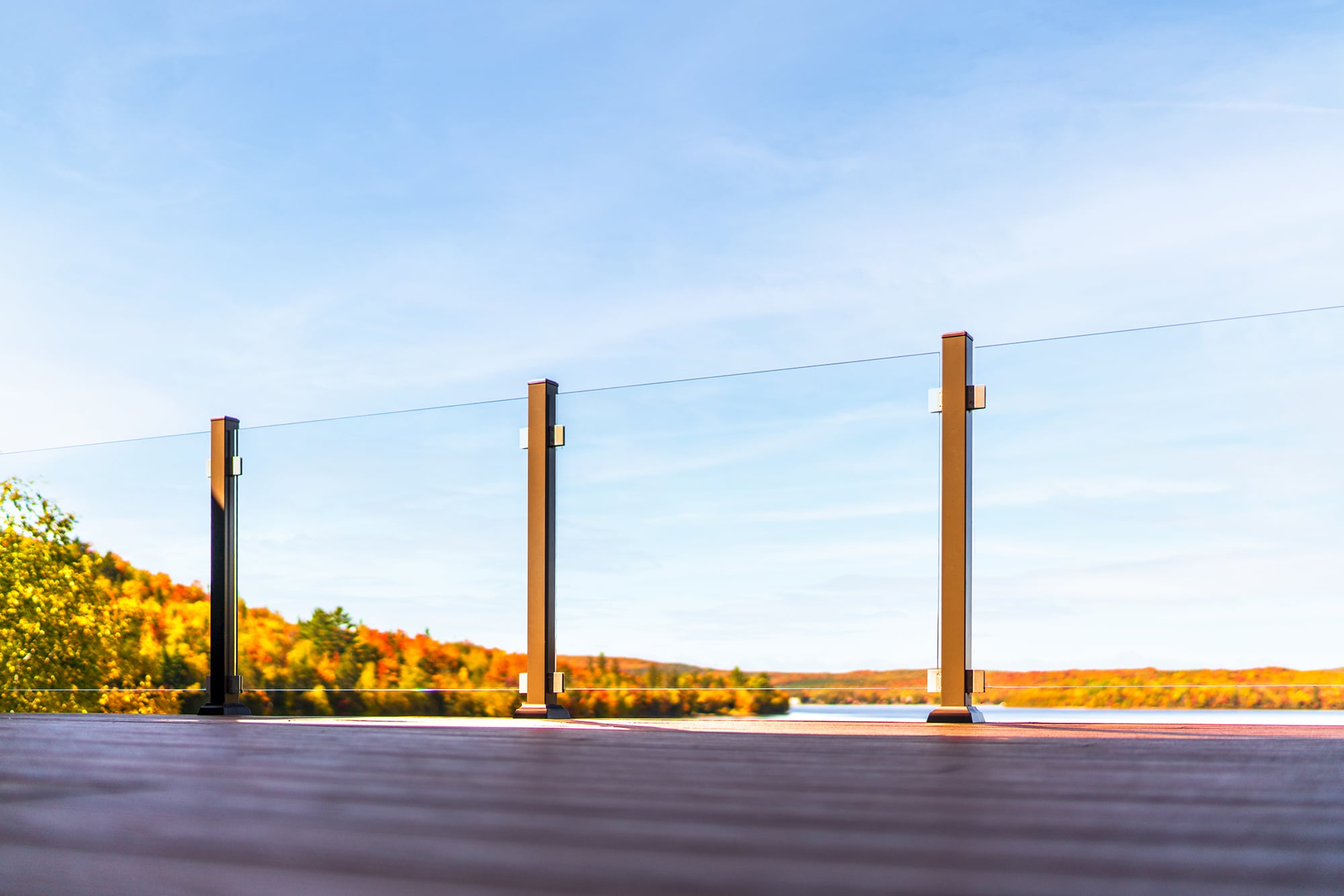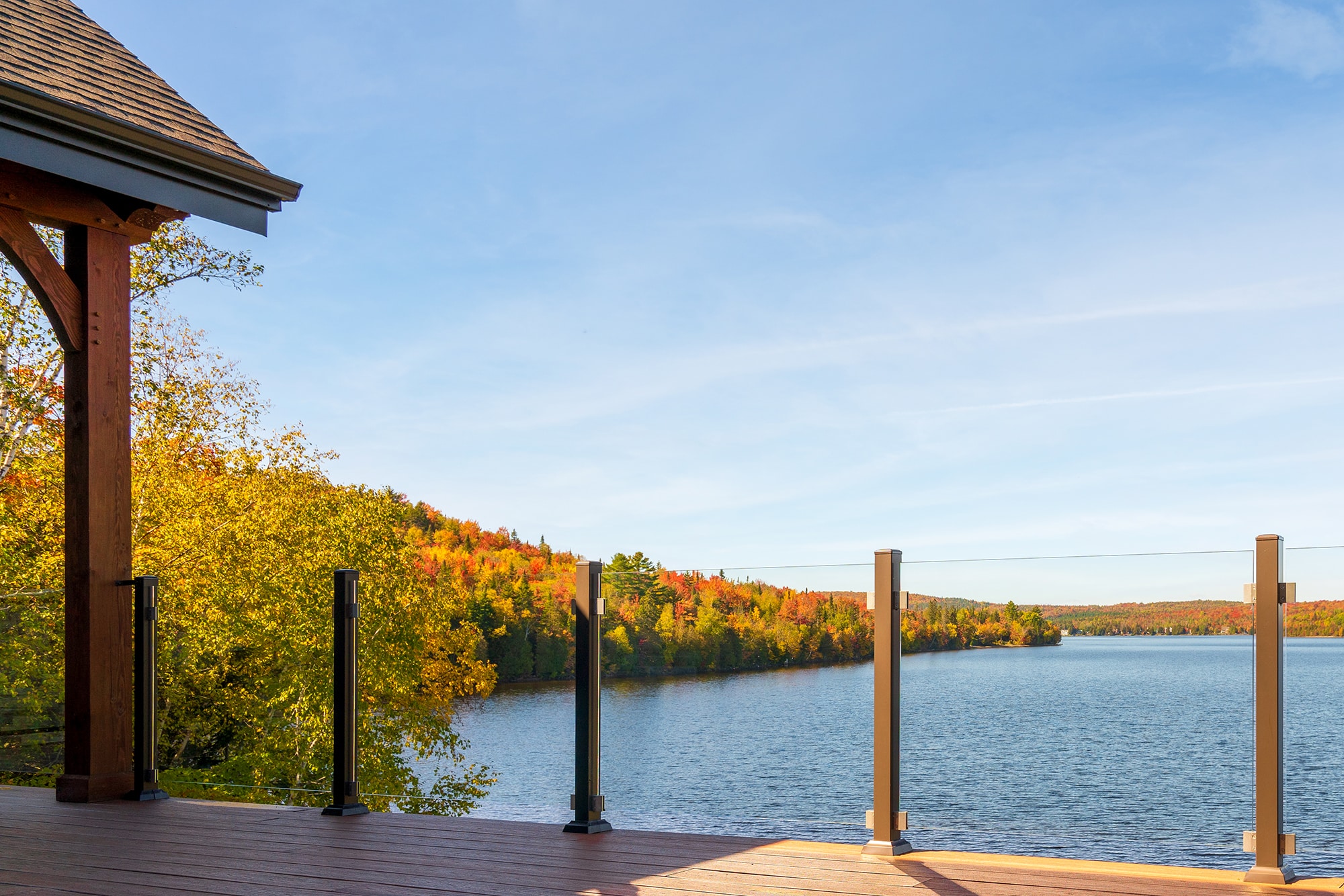 Clear Glass Panels: The ideal choice for an unobstructed view. Safety glass panels create an unobtrusive barrier that maximizes lake and forest views.