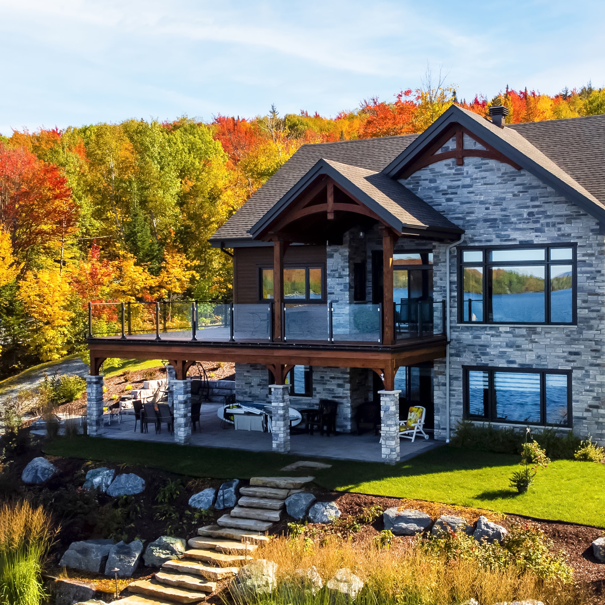 This exceptional project, located on Chemin J.E Fortin in Adstock, is a true celebration of nature and modern architecture. The objective was to secure a large balcony offering a breathtaking view of the lake and autumn colors, while maximizing transparency. Our Contemporary railing with glass panels was chosen for its minimalist aesthetic, which blends perfectly with the style of the residence and its wooded surroundings.