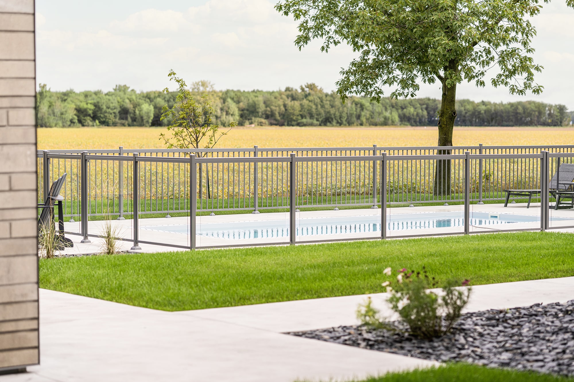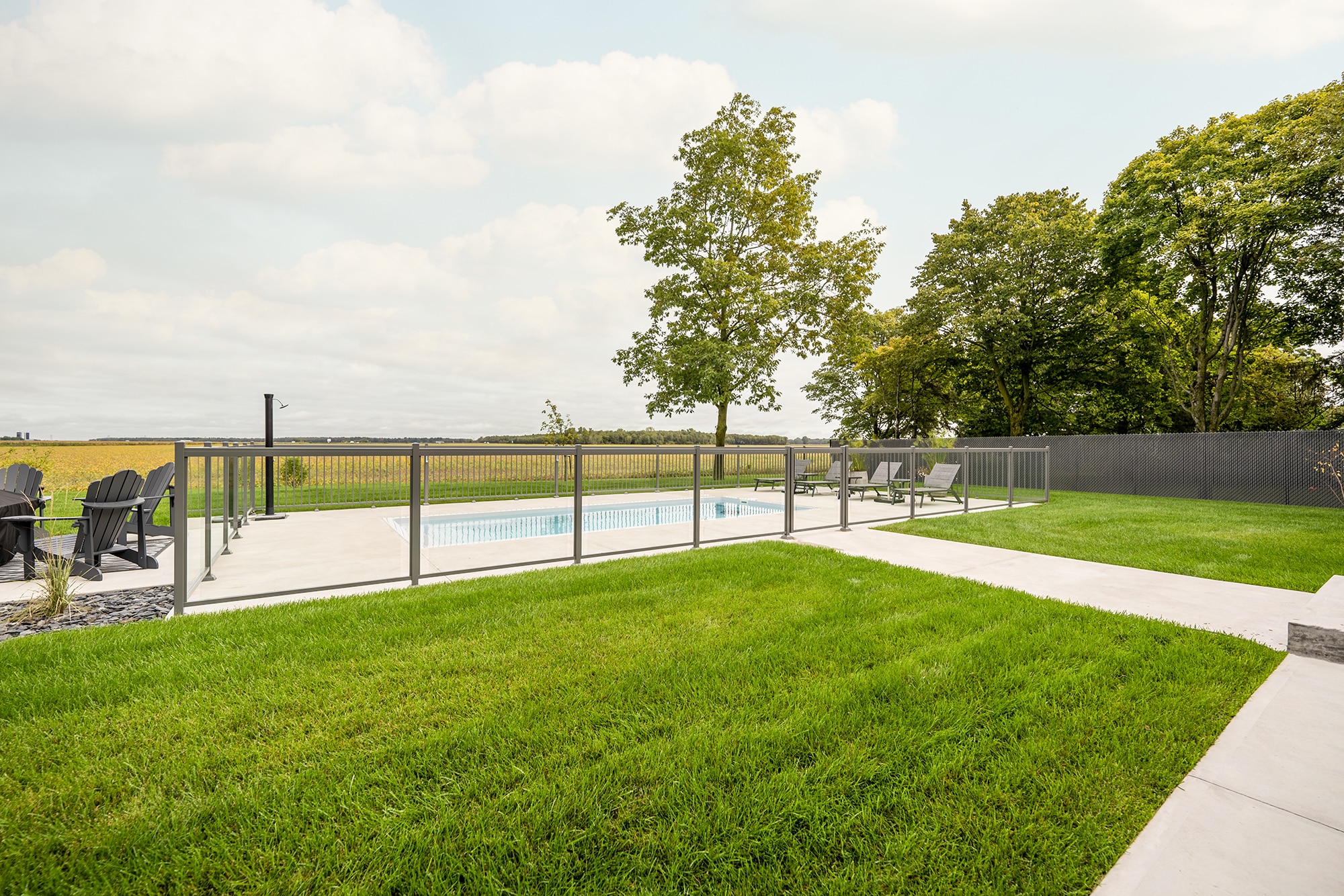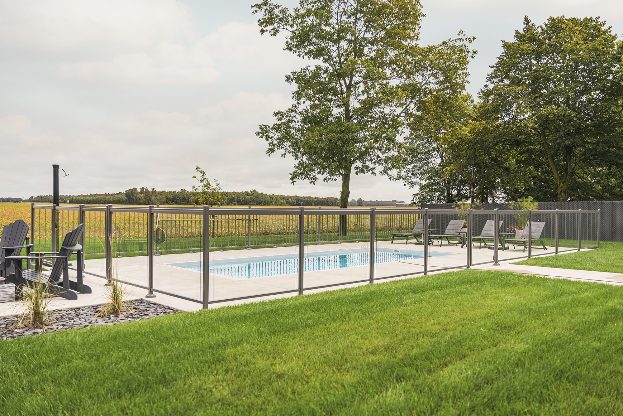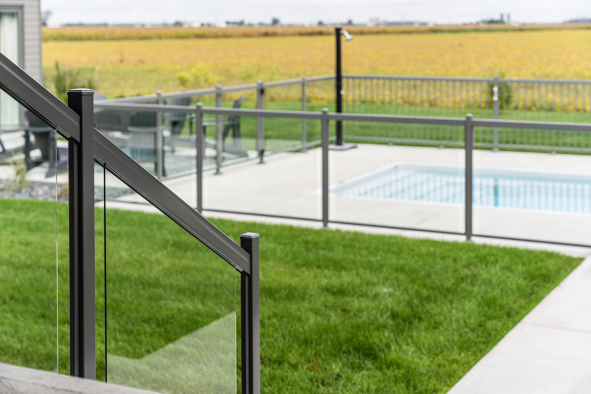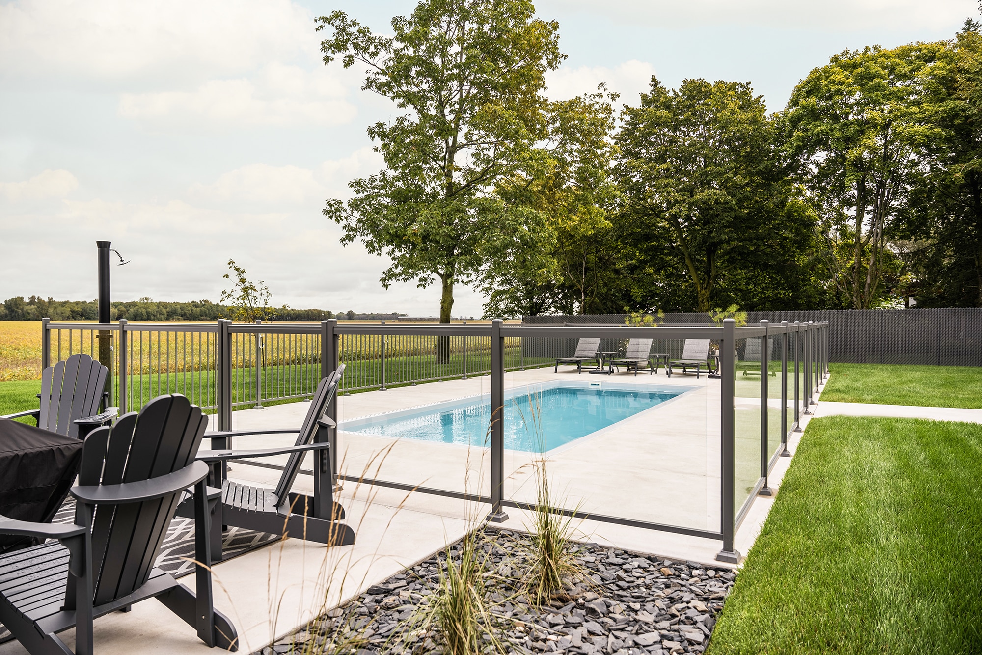 This project on Grand Rang in St-Hyacinthe features a complete pool enclosure design, combining our Murano and Standard railings to create a safe, elegant space that blends seamlessly into the vast surrounding grounds. Thanks to a blend of transparency and clean lines, the pool area benefits from a modern aesthetic while complying with safety standards.