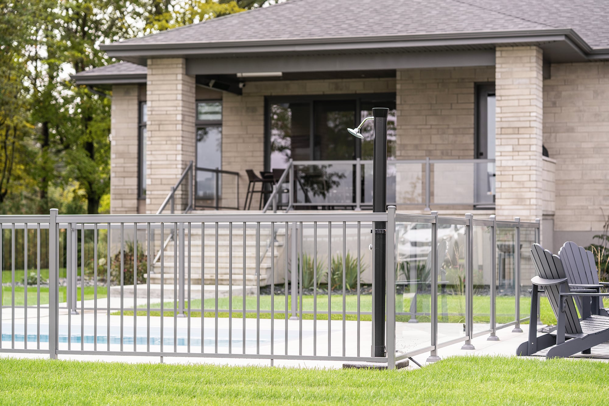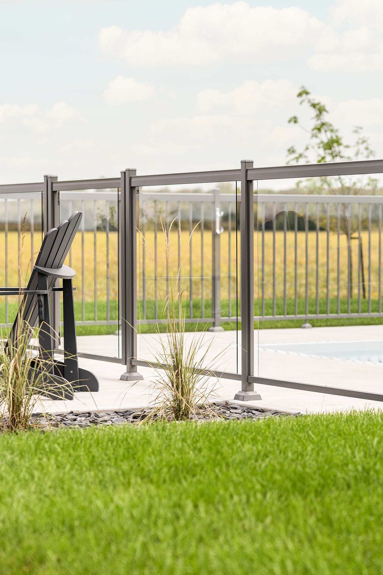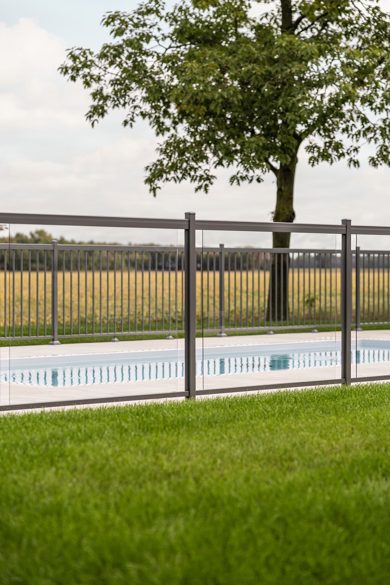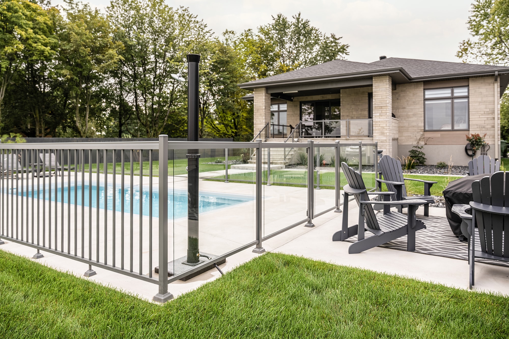 This project on Grand Rang in St-Hyacinthe features a complete pool enclosure design, combining our Murano and Standard railings to create a safe, elegant space that blends seamlessly into the vast surrounding grounds. Thanks to a blend of transparency and clean lines, the pool area benefits from a modern aesthetic while complying with safety standards.