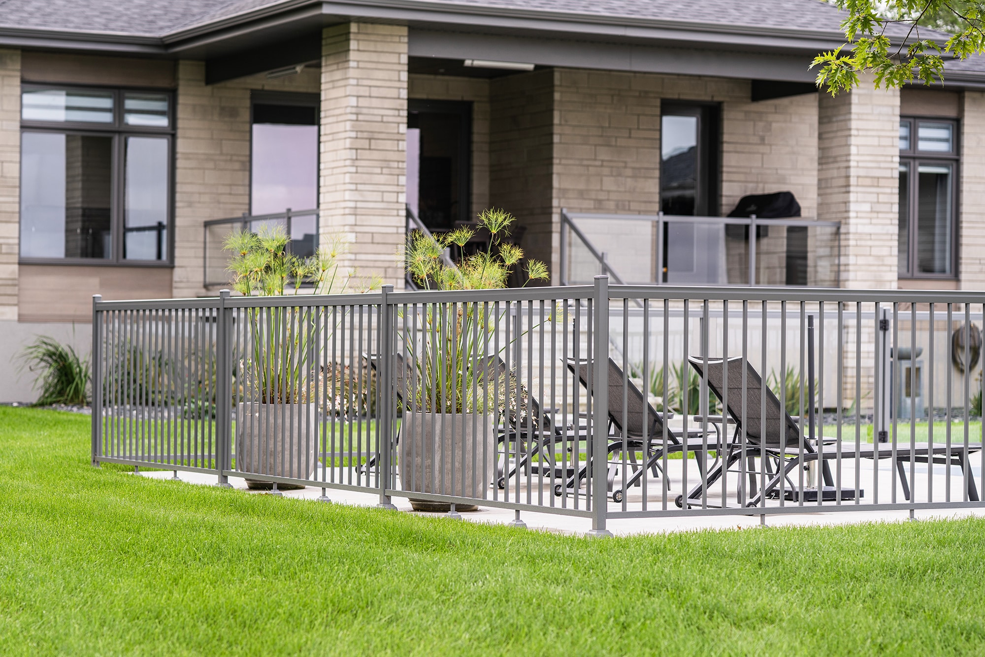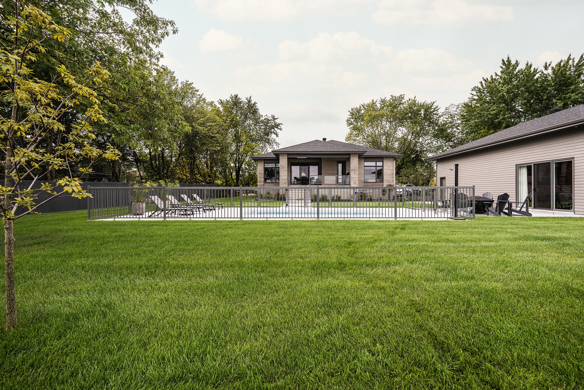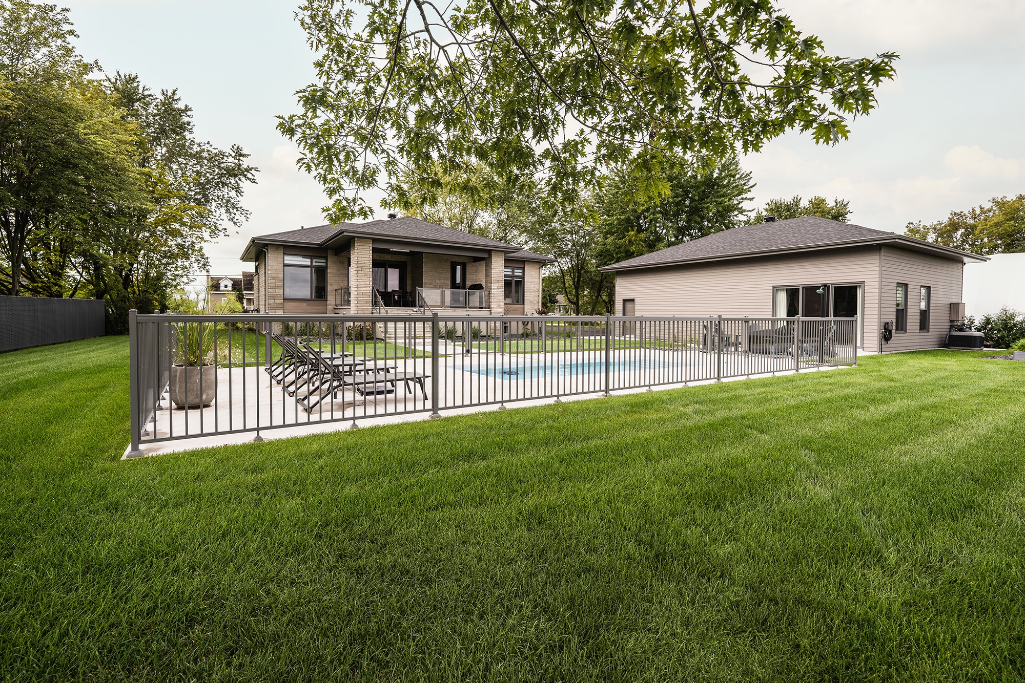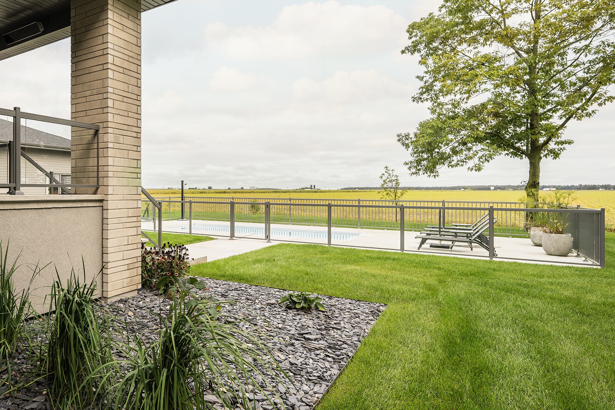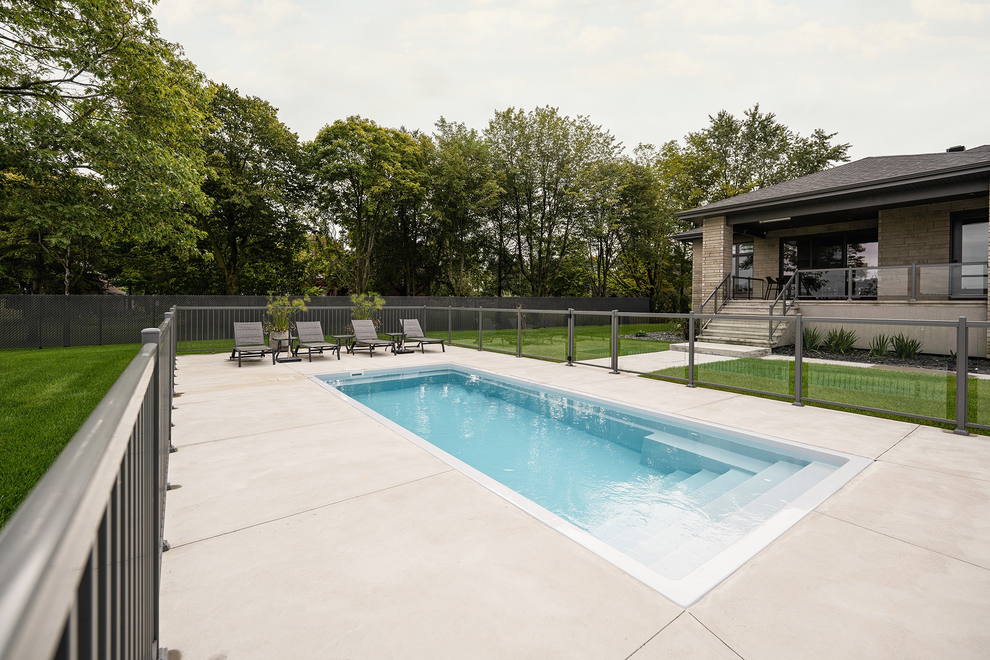 This project on Grand Rang in St-Hyacinthe features a complete pool enclosure design, combining our Murano and Standard railings to create a safe, elegant space that blends seamlessly into the vast surrounding grounds. Thanks to a blend of transparency and clean lines, the pool area benefits from a modern aesthetic while complying with safety standards.