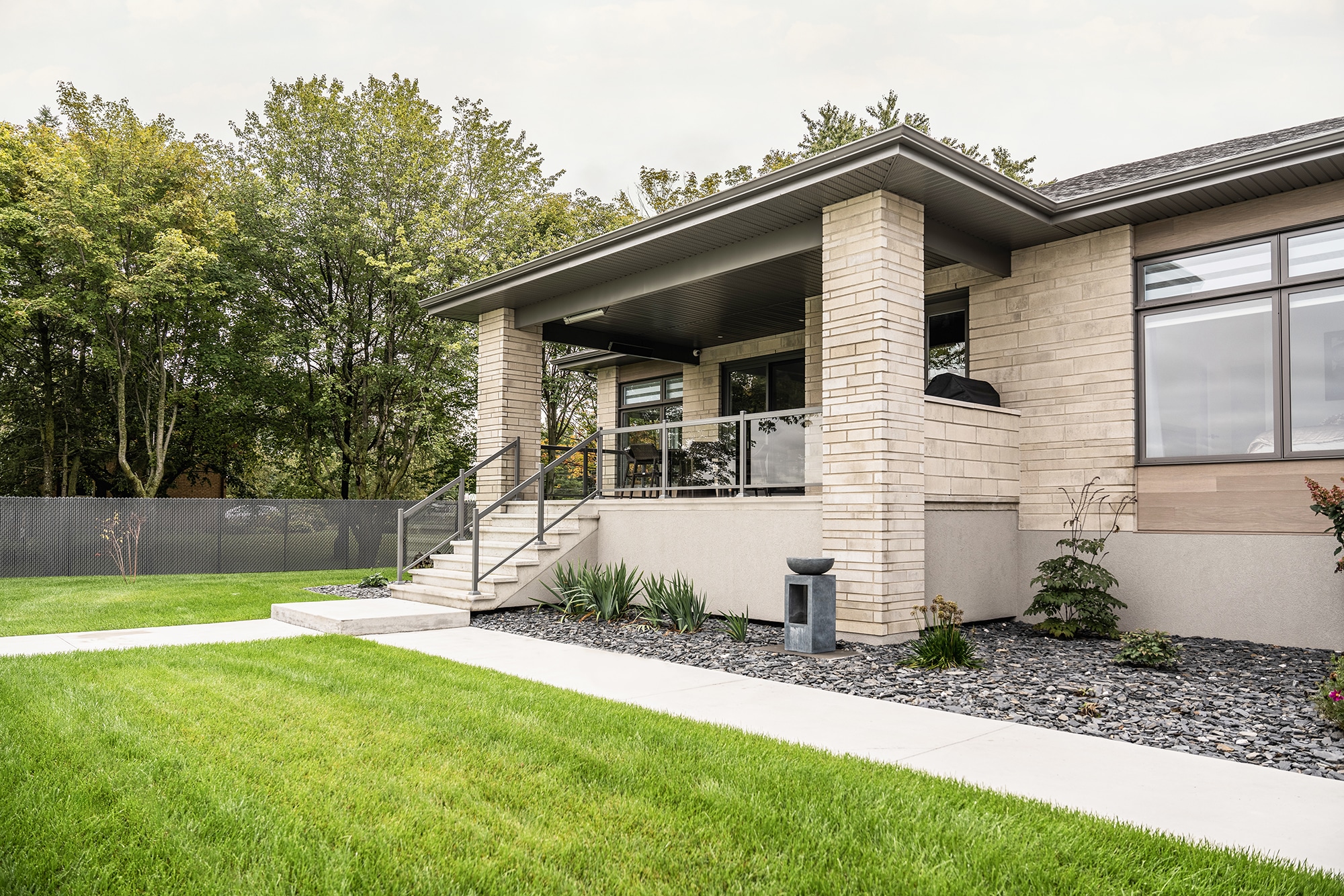 Pale gray finish: a modern, harmonious choice that perfectly matches the house, paving stones and natural colors of the landscape.