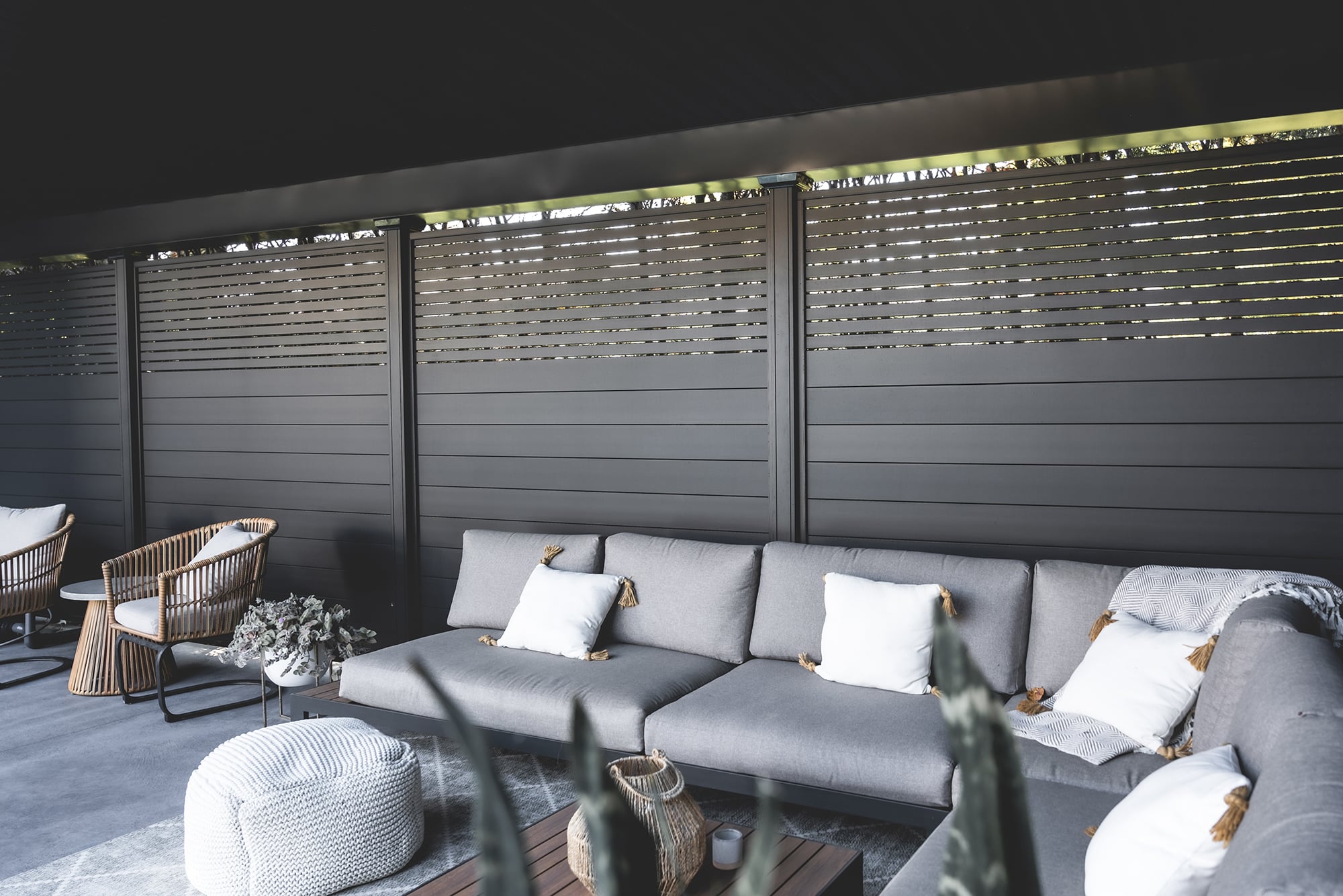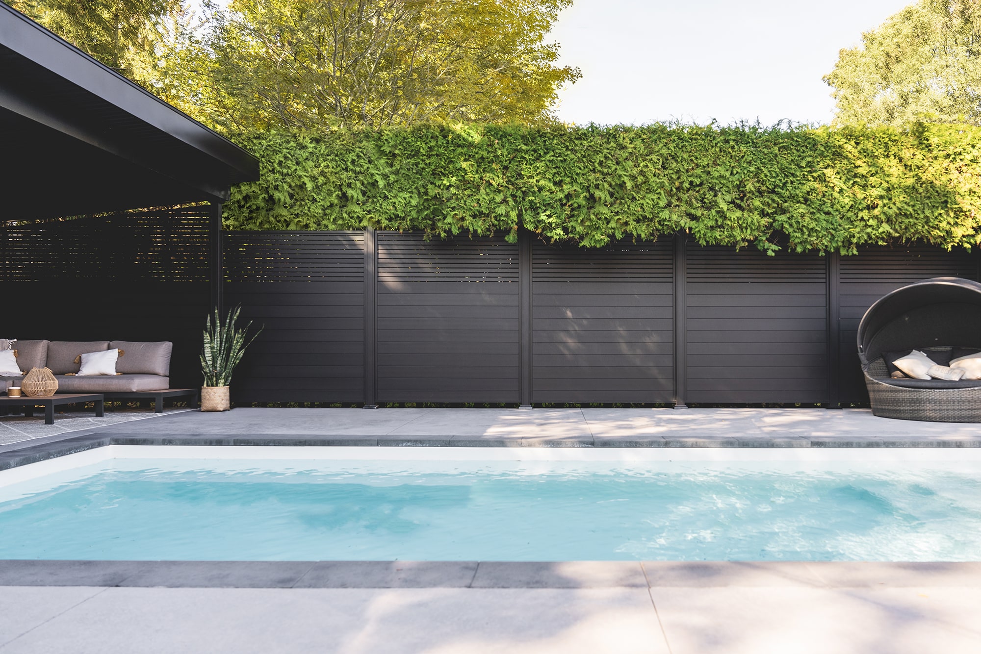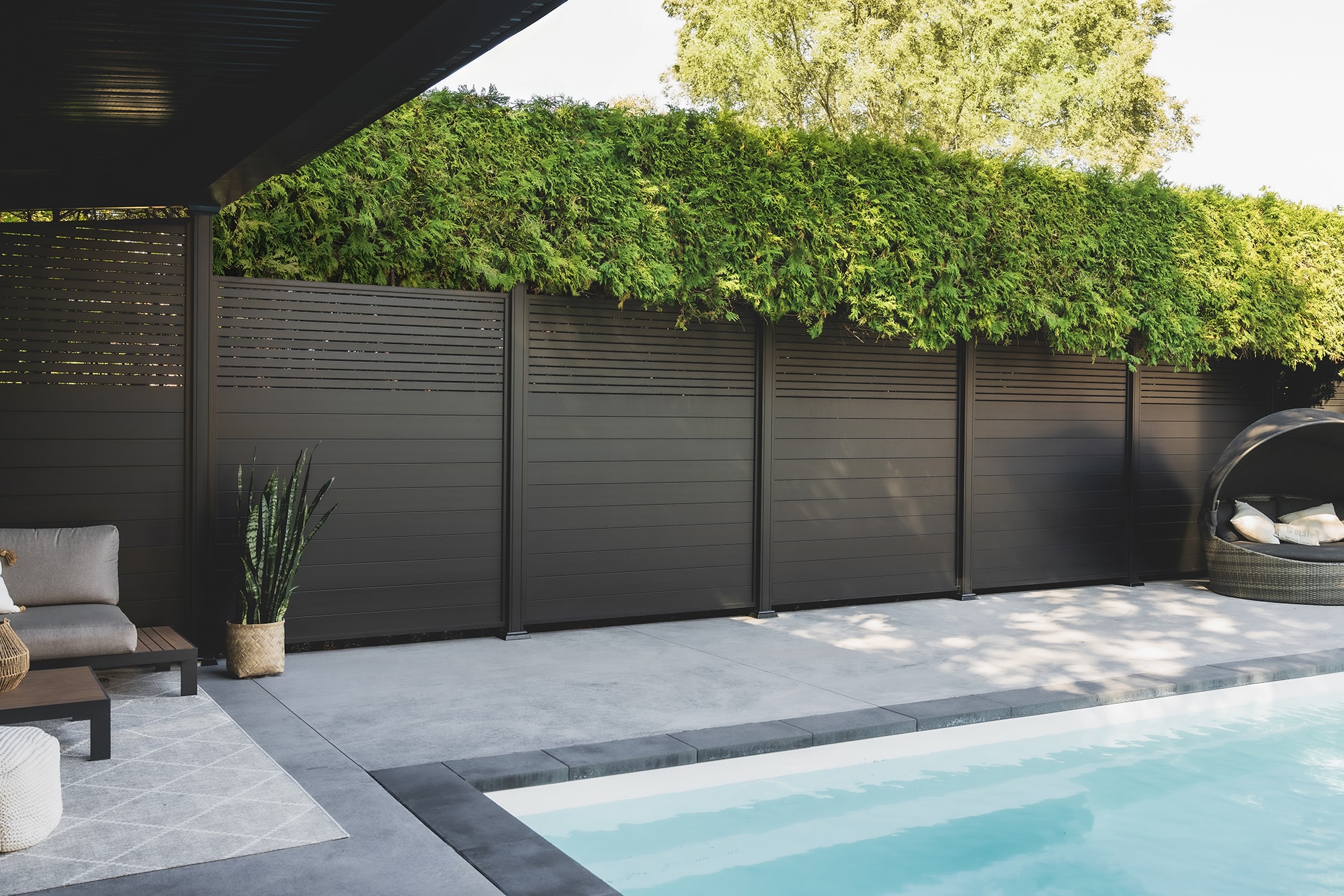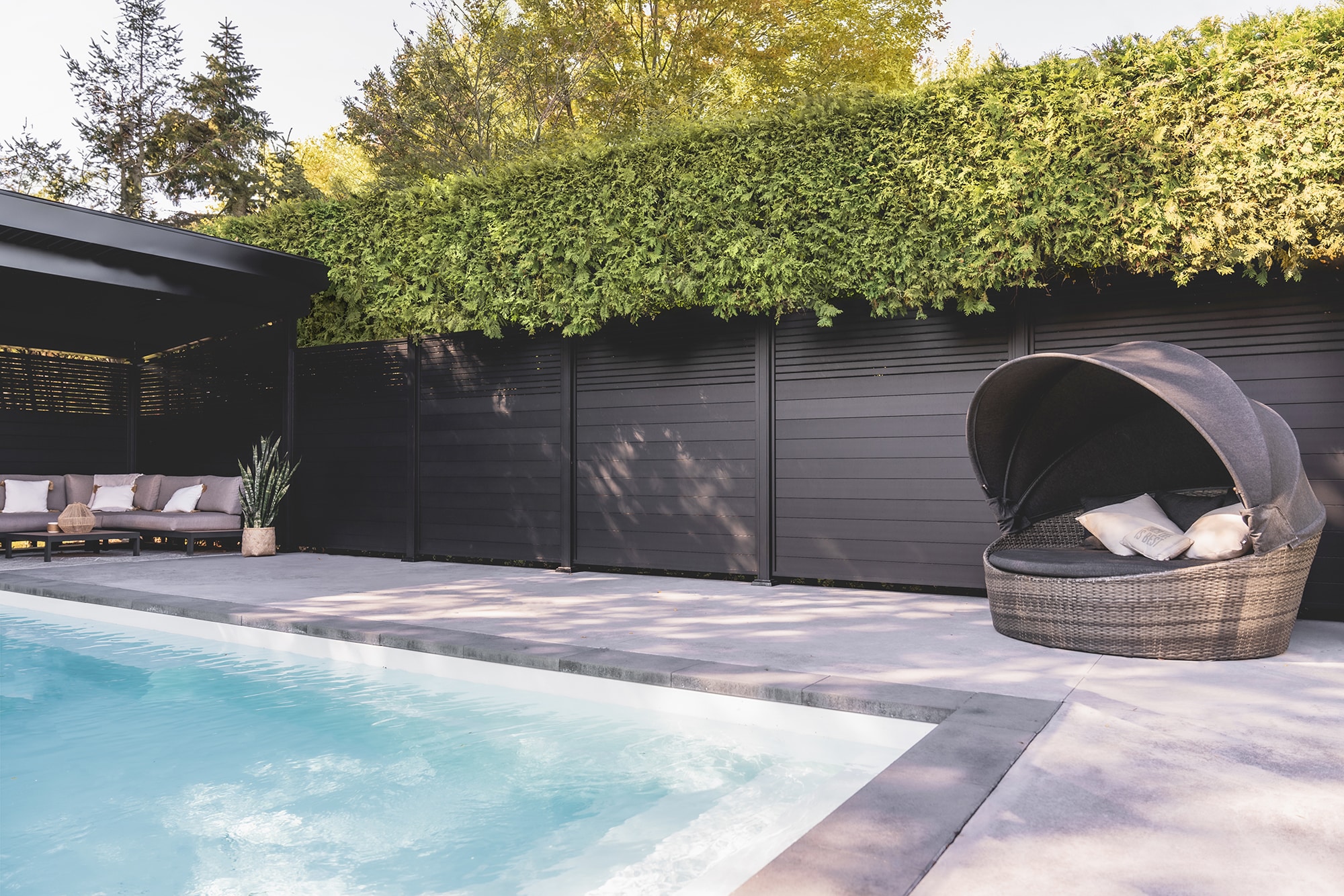 A full-height fence in matt black aluminum provides complete privacy while adding a contemporary touch to the dรฉcor. Its sleek design blends in perfectly with the surrounding landscape, creating a seamless effect with the terrace and outdoor furniture.