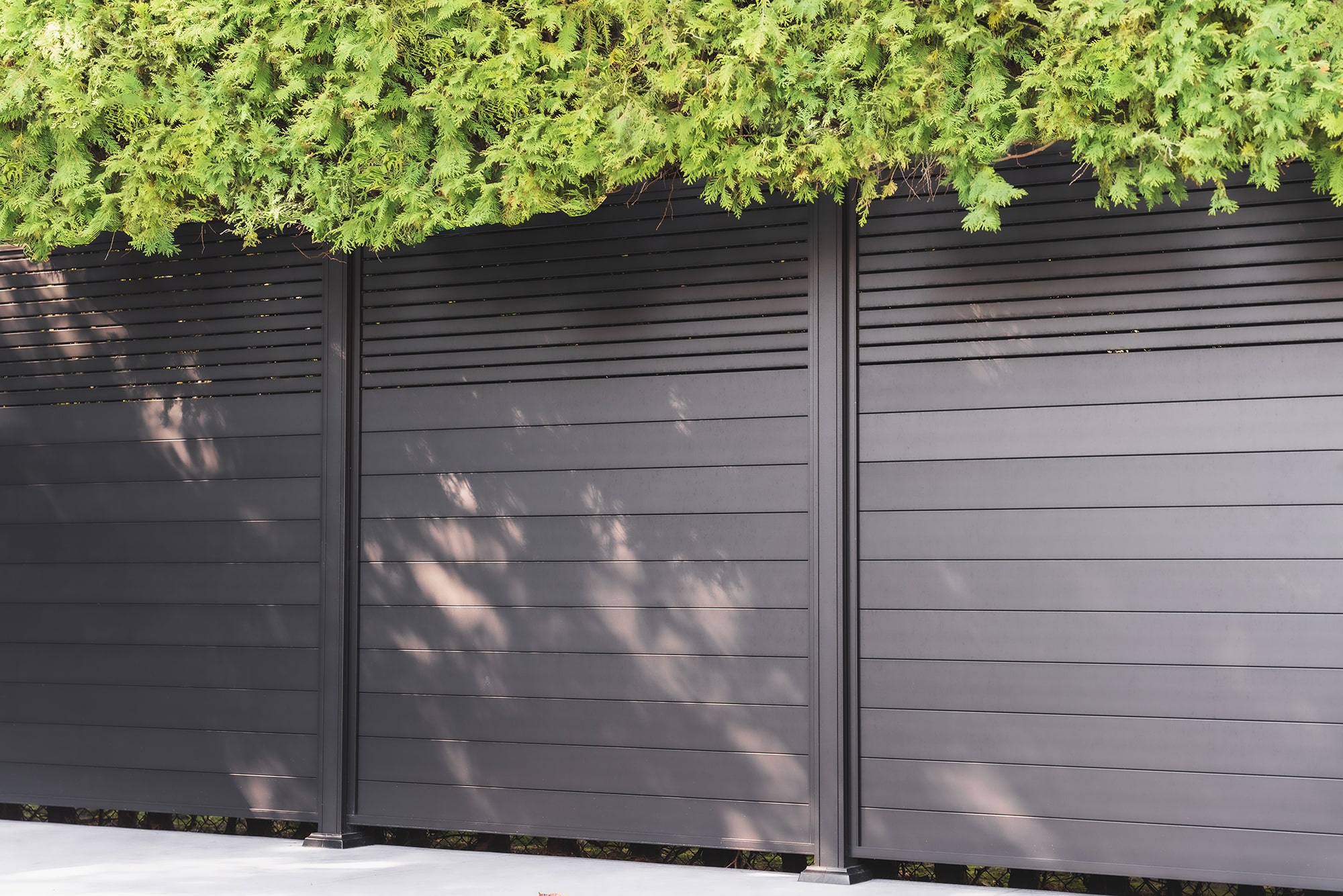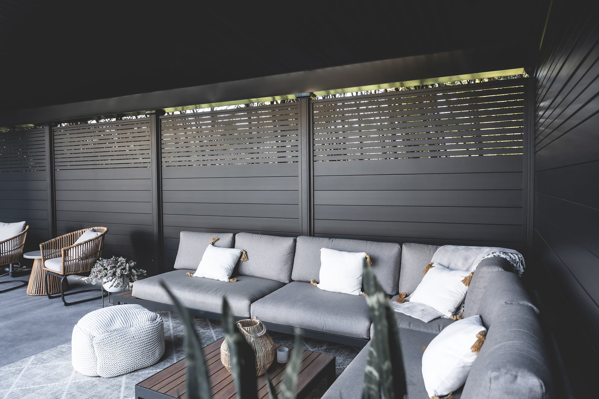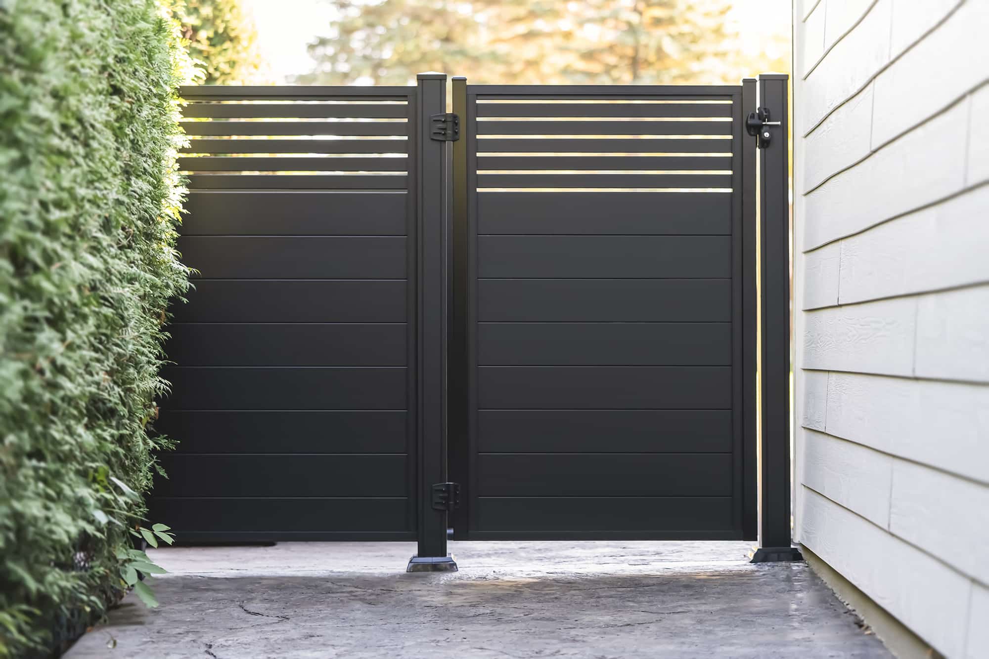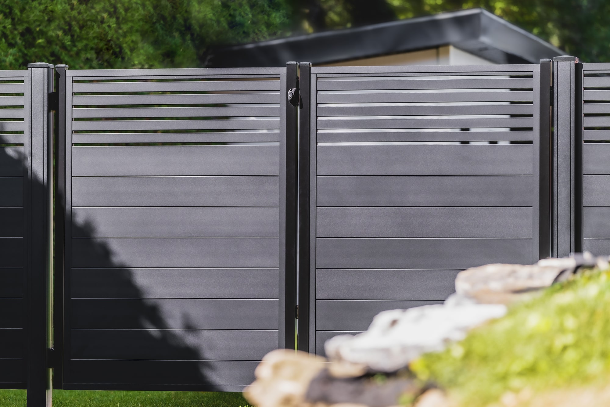 A full-height fence in matt black aluminum provides complete privacy while adding a contemporary touch to the dรฉcor. Its sleek design blends in perfectly with the surrounding landscape, creating a seamless effect with the terrace and outdoor furniture.