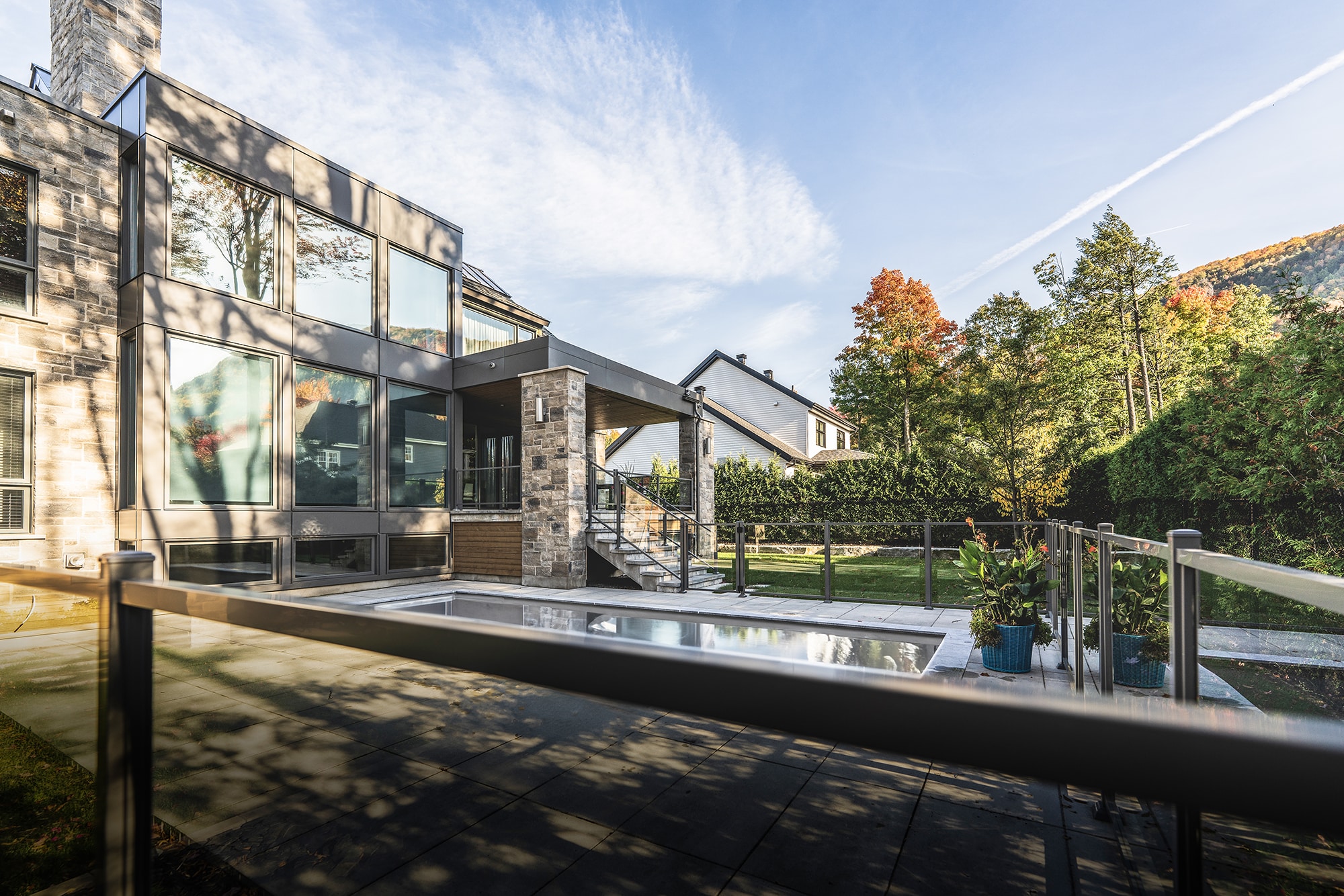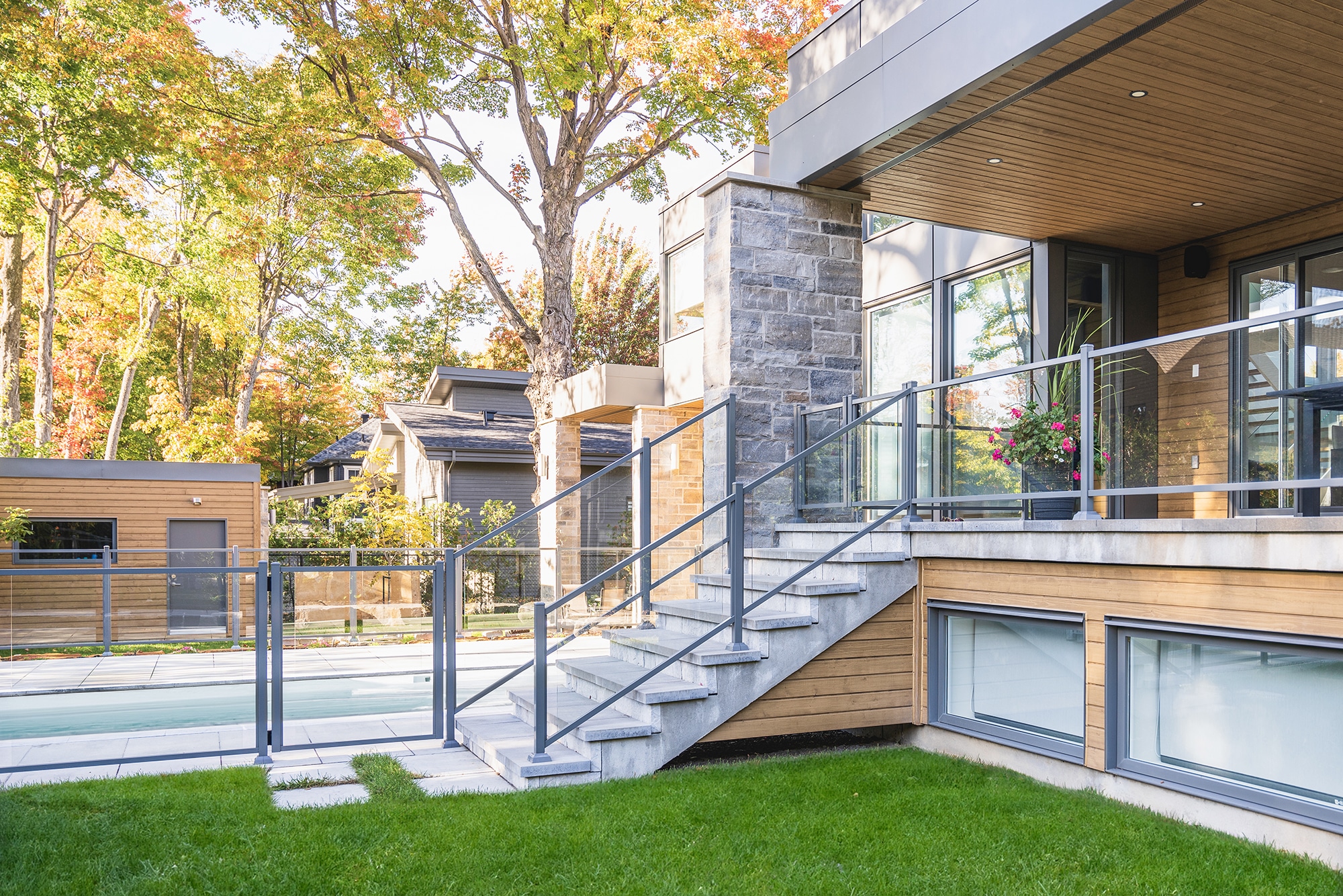 Discreet integration into the landscape: the transparency of the glass preserves the visual openness to the courtyard, pool and surrounding trees.