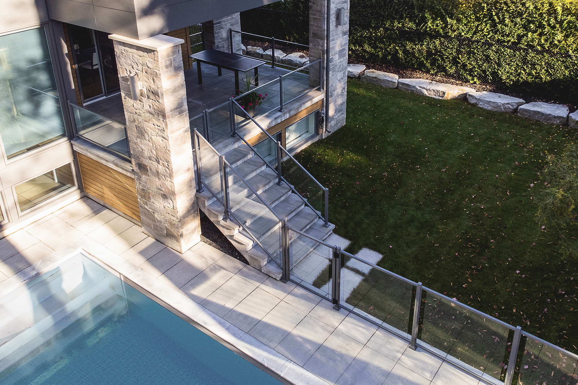 An elegant, modern and safe pool enclosure, where the Murano railing provides maximum protection without compromising the view or the aesthetics of the decor. The result is a bright, harmonious outdoor space perfectly suited to family life around the pool.