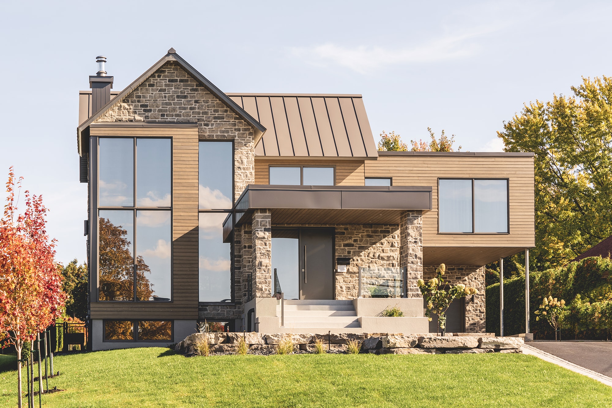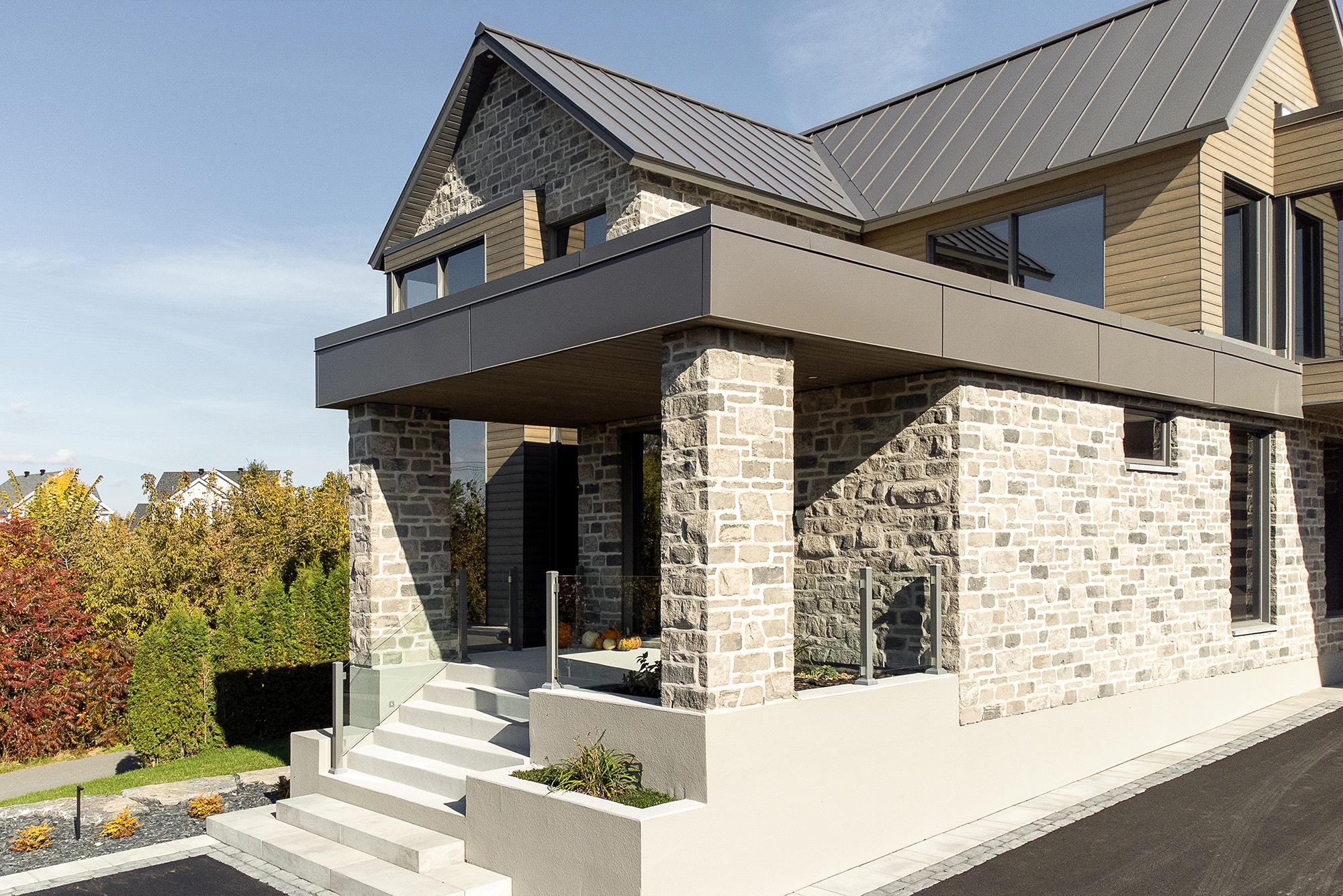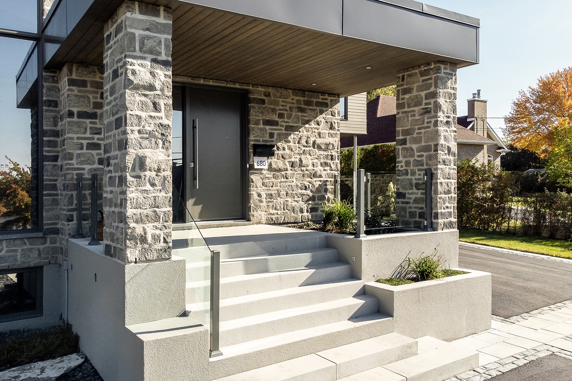 The result is a home entrance that’s welcoming, bright and contemporary. Thanks to the Contemporaine glass railing, the faรงade gains in elegance while retaining a light, timeless look.