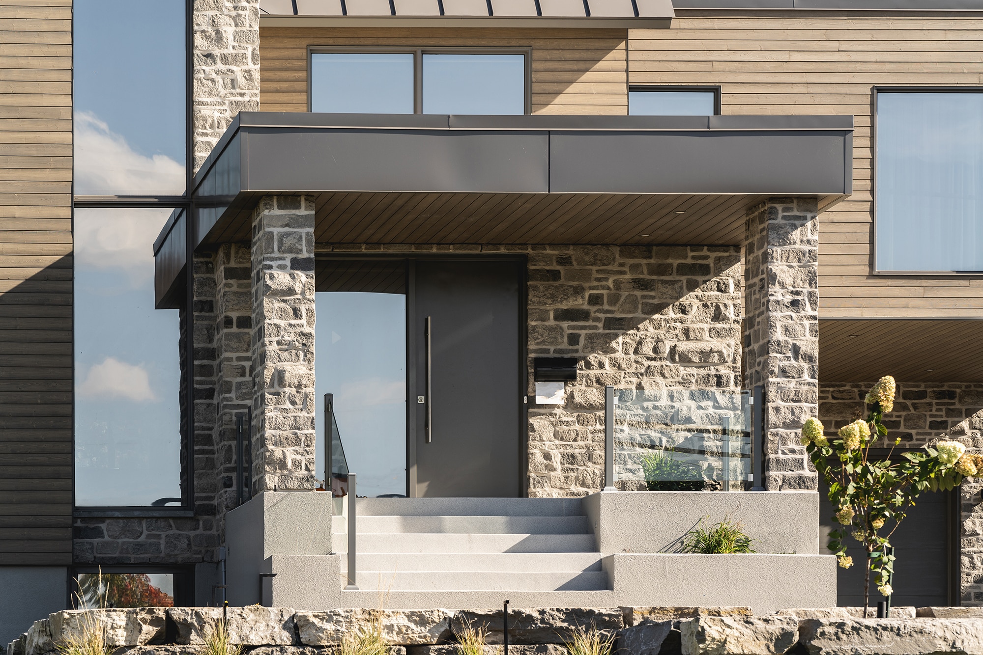 Located in Mont-Saint-Hilaire, this residential project showcases a home entrance with a clean, modern design. The objective was to create a safe and elegant reception area, while maximizing the brightness and visibility of the faรงade.