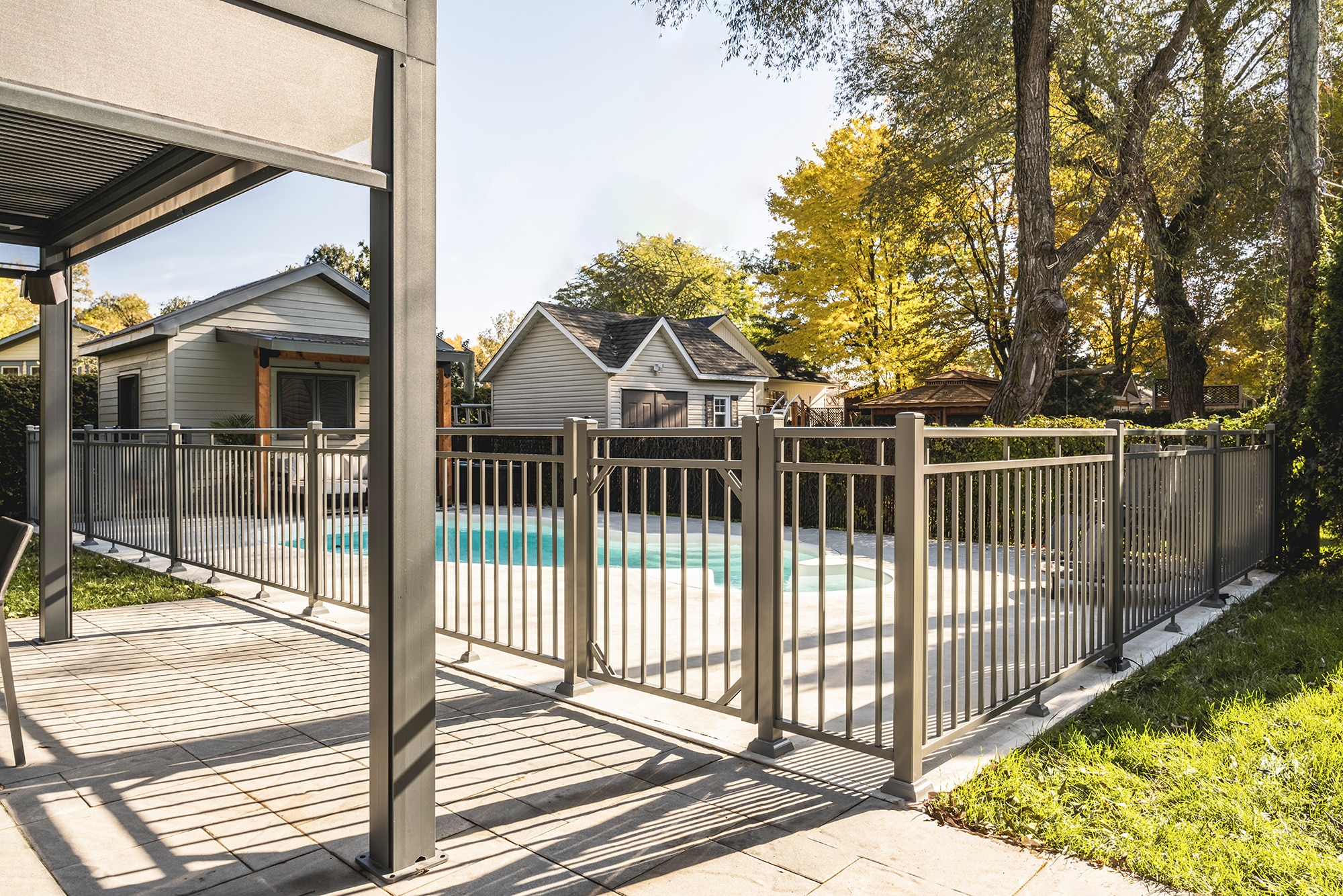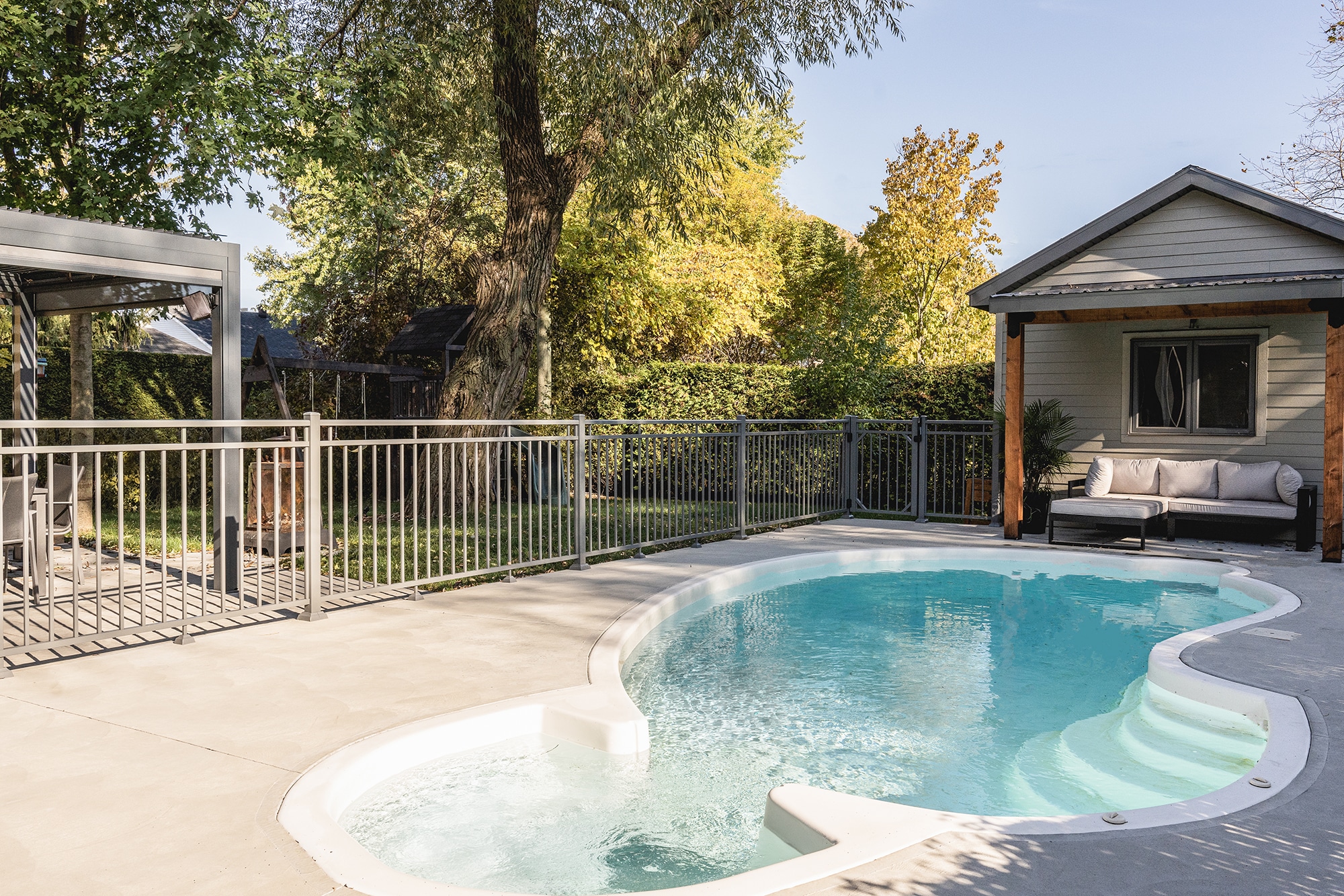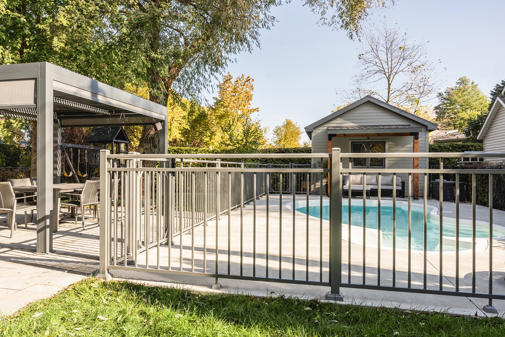 Completed in La Présentation, this landscaping project features our Patrimoine model in an elegant, luminous gray hue. The objective was to secure the perimeter of the in-ground pool while maintaining a soft visual harmony with the adjacent concrete sidewalk, garden shed and pergola.
