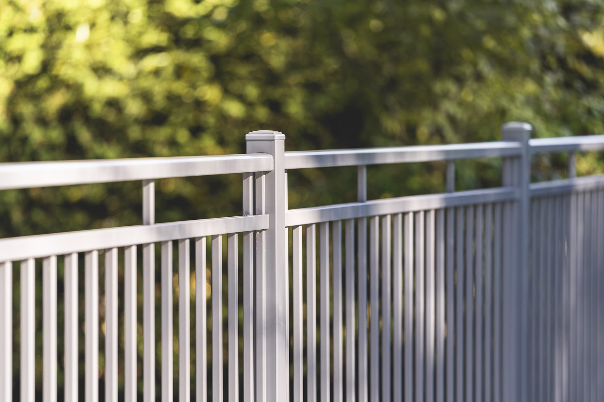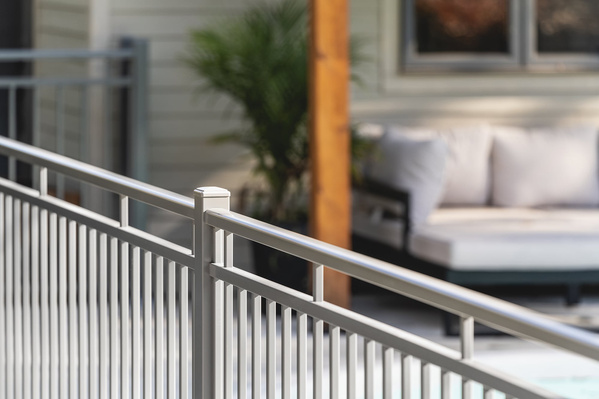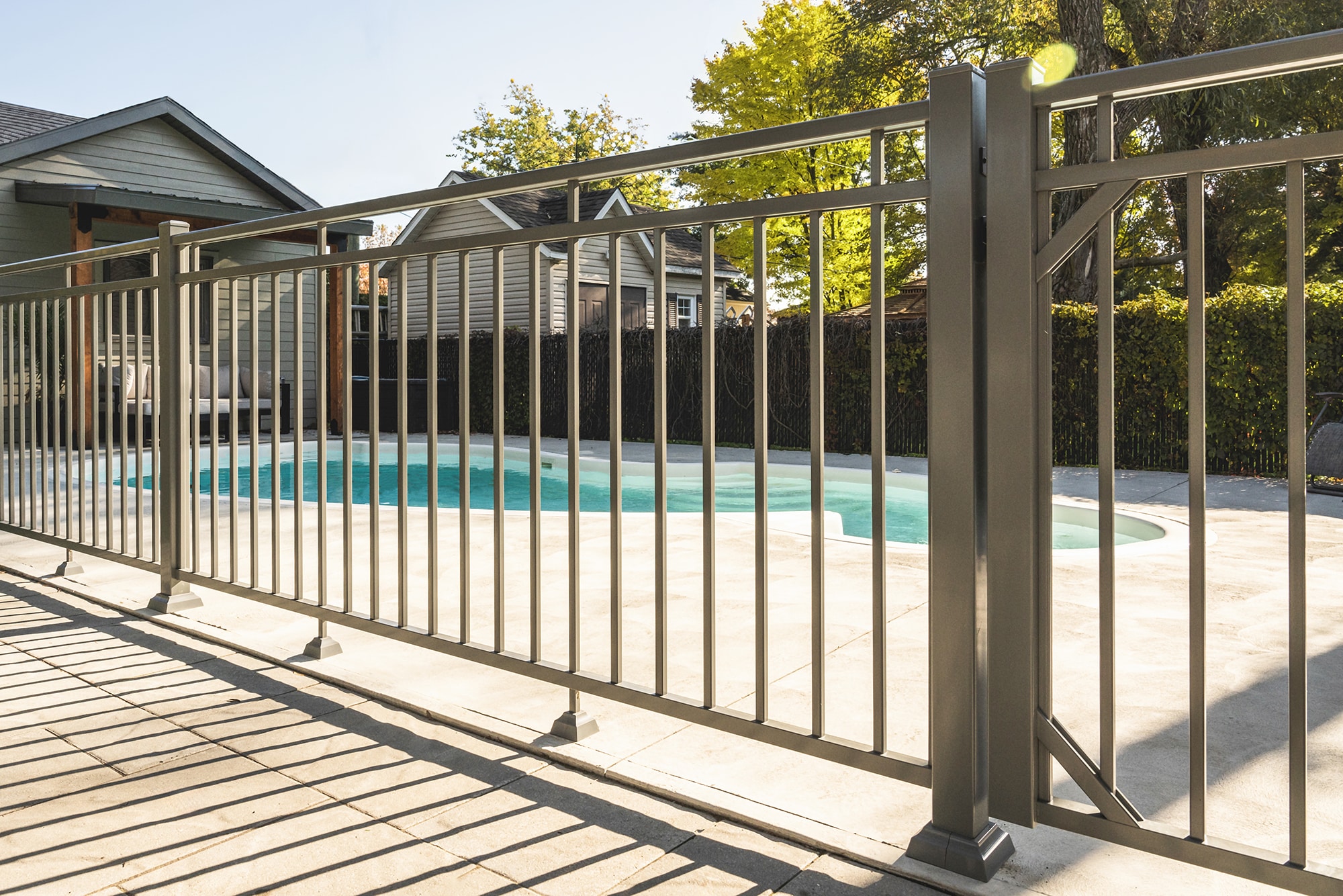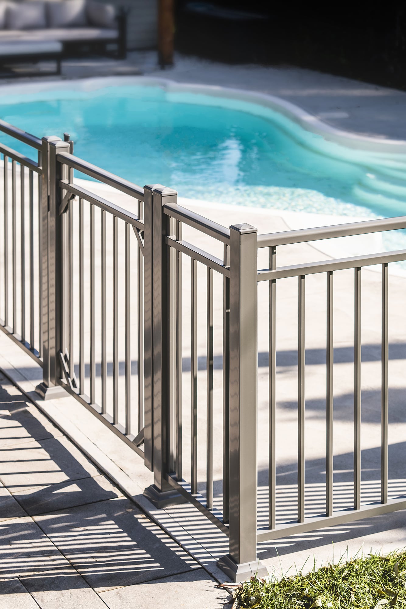 Completed in La Présentation, this landscaping project features our Patrimoine model in an elegant, luminous gray hue. The objective was to secure the perimeter of the in-ground pool while maintaining a soft visual harmony with the adjacent concrete sidewalk, garden shed and pergola.